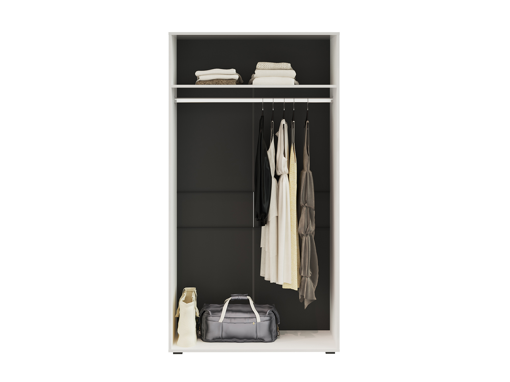 Распашной шкаф Глосс гармонично дополнит систему хранения в гостиной или спальне. Внутреннее пространство представлено вместительной нишей с продольной штангой для вешалок и широкой антресольной полкой. Эффектные глянцевые фасады белого цвета визуально расширят пространство в комнате.