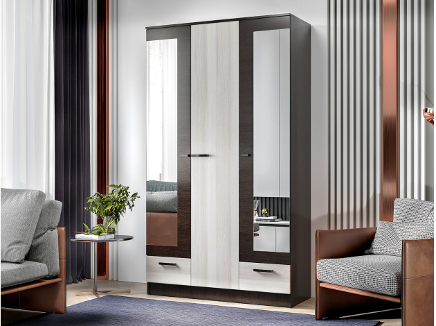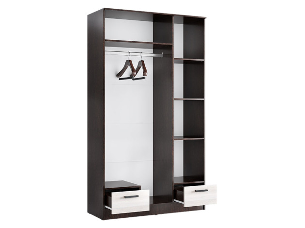 Распашной шкаф Адель разделен на две функциональные зоны: с одной стороны предусмотрены широкая штанга для плечиков, антресольная полка и выдвижной ящик, с другой — стеллажная секция и выдвижной ящик. Два фасада оборудованы полноростовыми зеркалами.