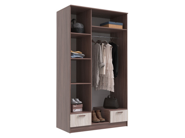 Распашной шкаф Адель разделен на две функциональные зоны: с одной стороны предусмотрены широкая штанга для плечиков, антресольная полка и выдвижной ящик, с другой — стеллажная секция и выдвижной ящик. Два фасада оборудованы полноростовыми зеркалами.