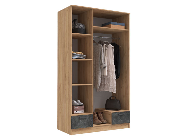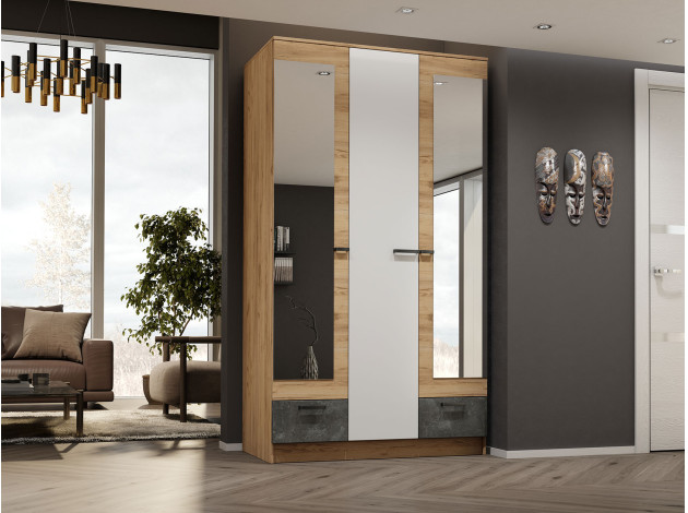 Распашной шкаф Адель разделен на две функциональные зоны: с одной стороны предусмотрены широкая штанга для плечиков, антресольная полка и выдвижной ящик, с другой — стеллажная секция и выдвижной ящик. Два фасада оборудованы полноростовыми зеркалами.