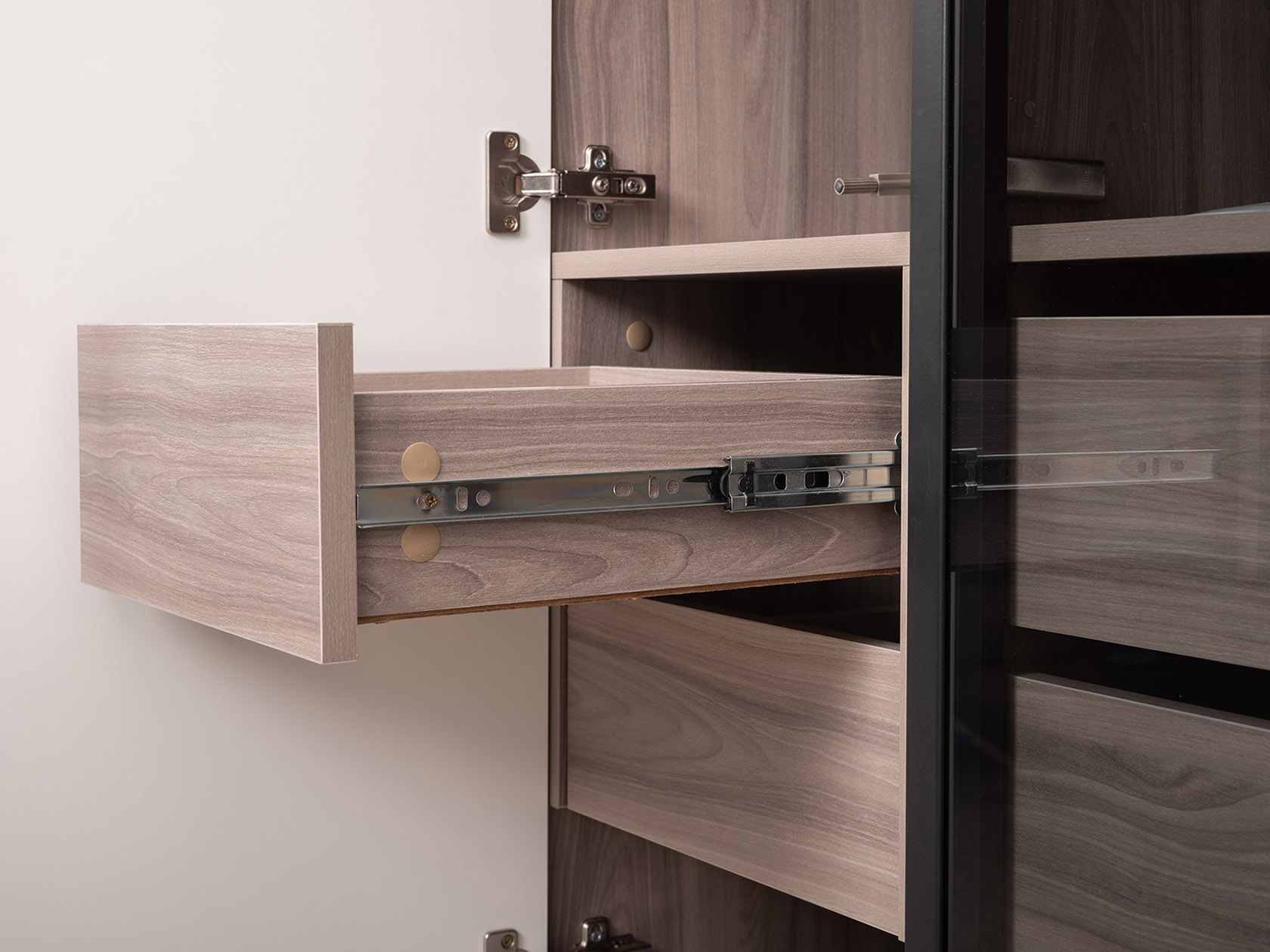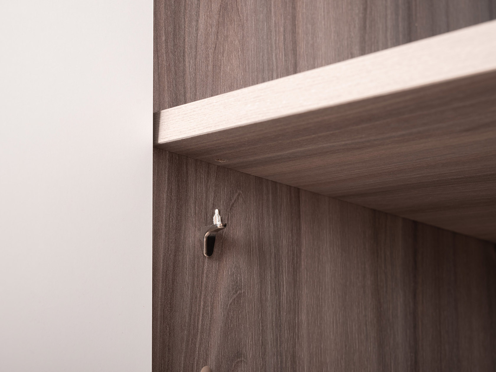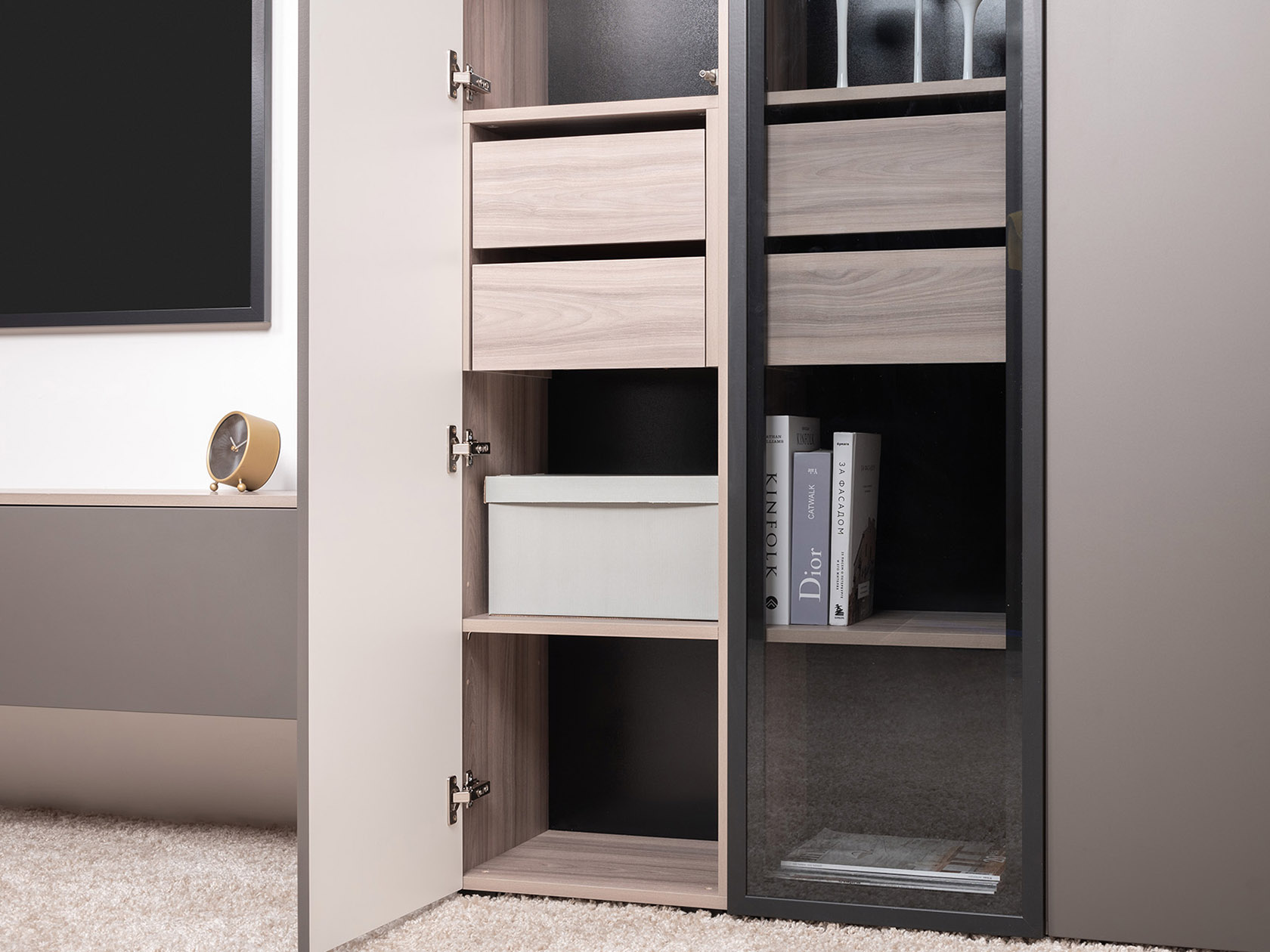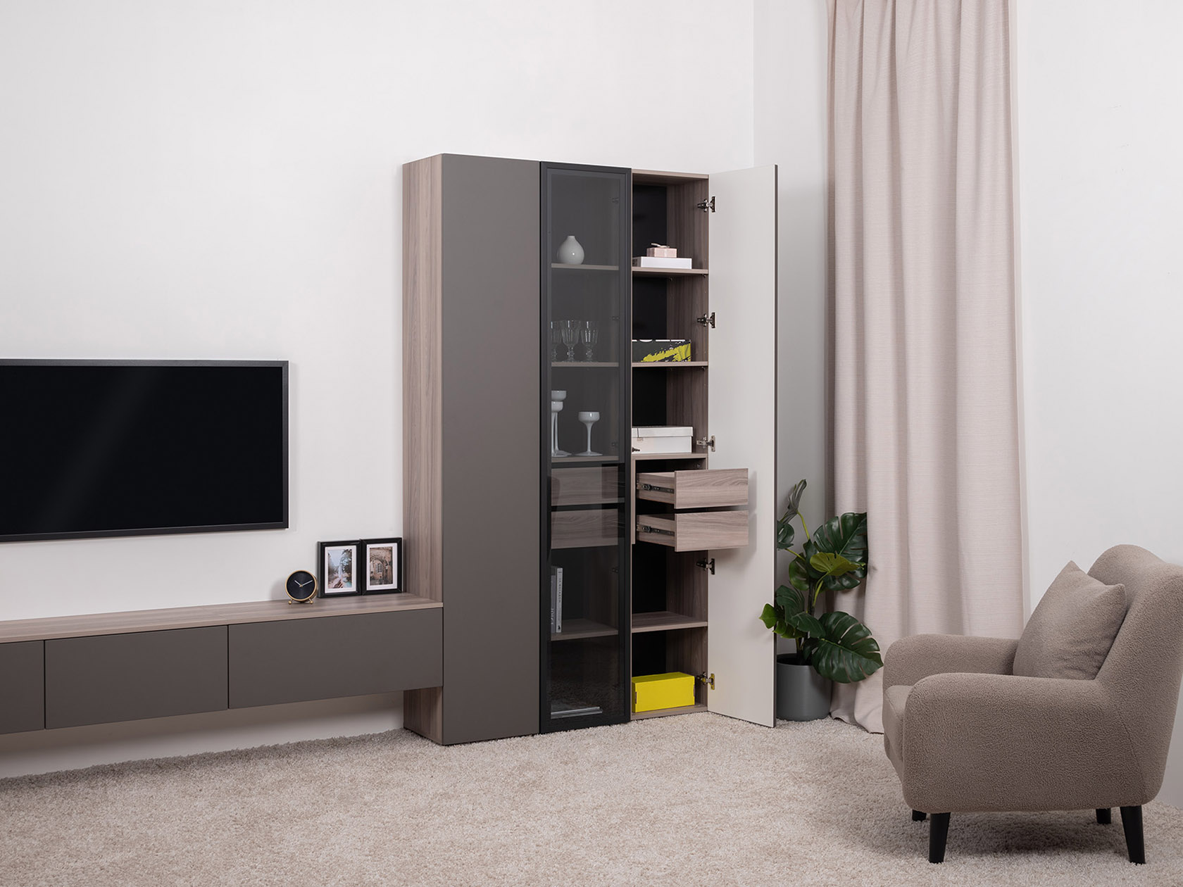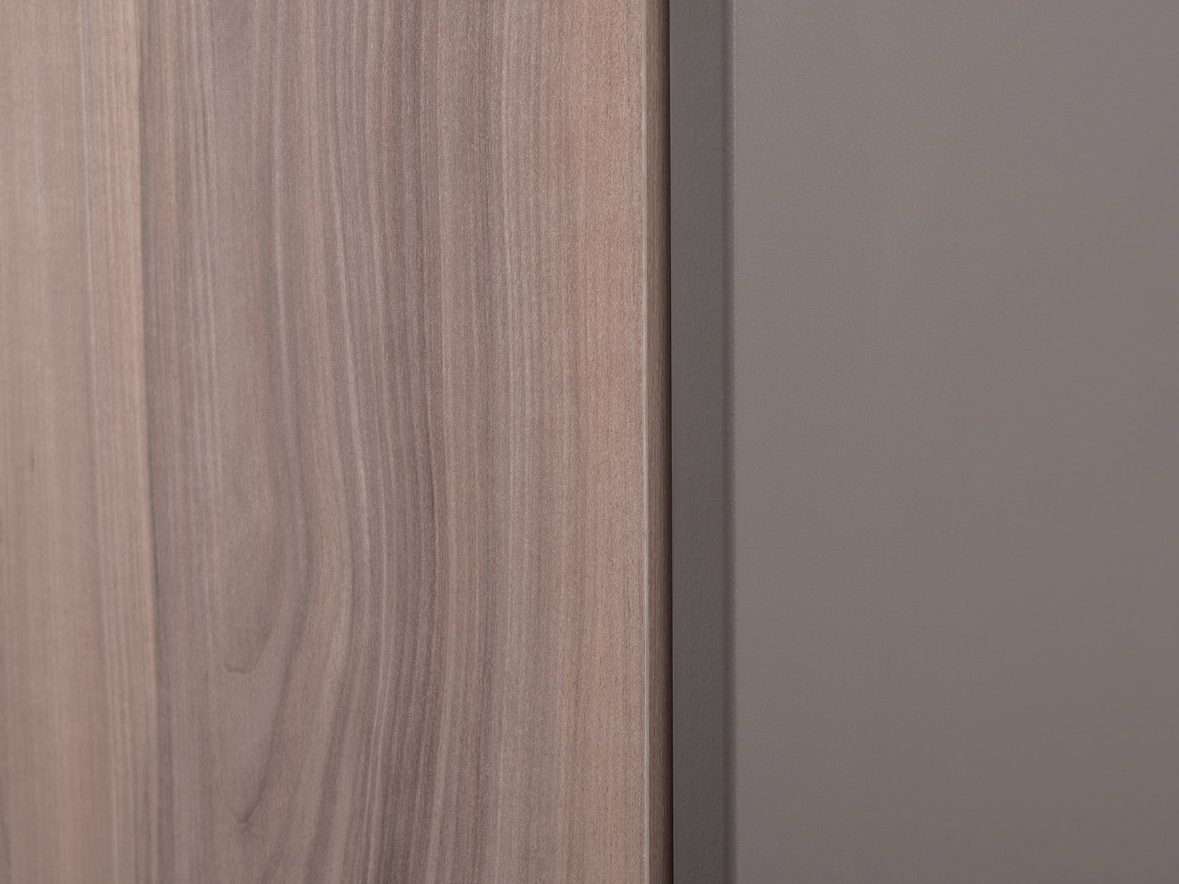 Распашной шкаф Роквуд — продуманная и удобная модель для хранения. Узкая конструкция легко интегрируется в ограниченное пространство. Высоту полок можно менять, настраивая их под индивидуальные потребности. Выдвижные ящики подходят для разных мелочей. Матовый фасад без ручек актуально смотрится в современном интерьере.