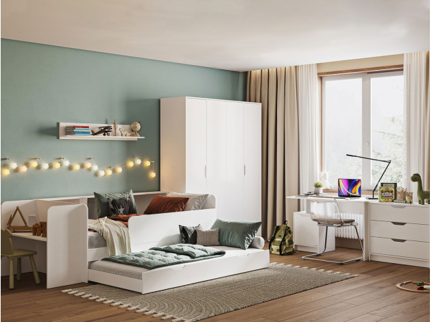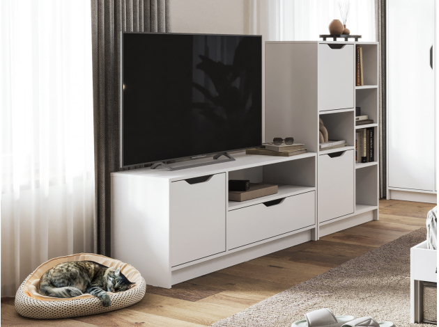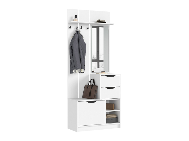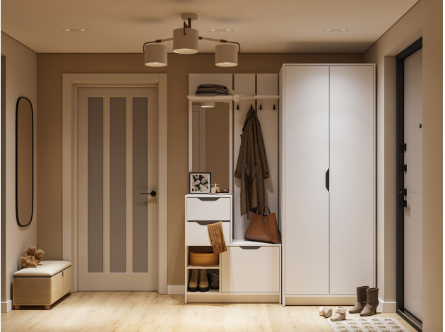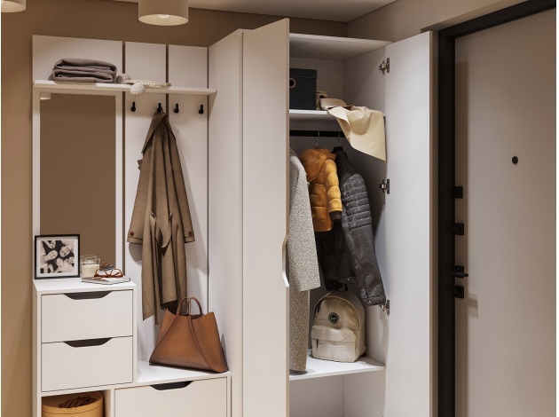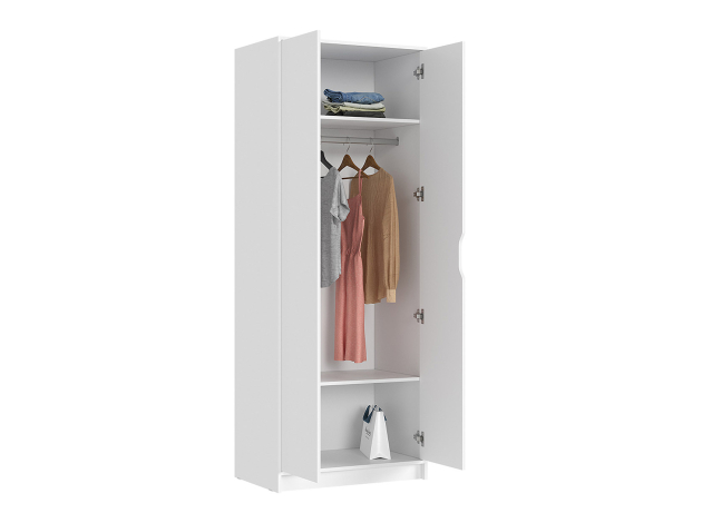 Распашной шкаф Руна подойдет ценителям практичности и строгого дизайна. В нише со штангой можно аккуратно развесить деликатные вещи и верхнюю одежду разной длины. На нижней полке удобно хранить сумку или коробку с обувью. Дверцы без выступающих ручек открываются за вырезы на фасадах.