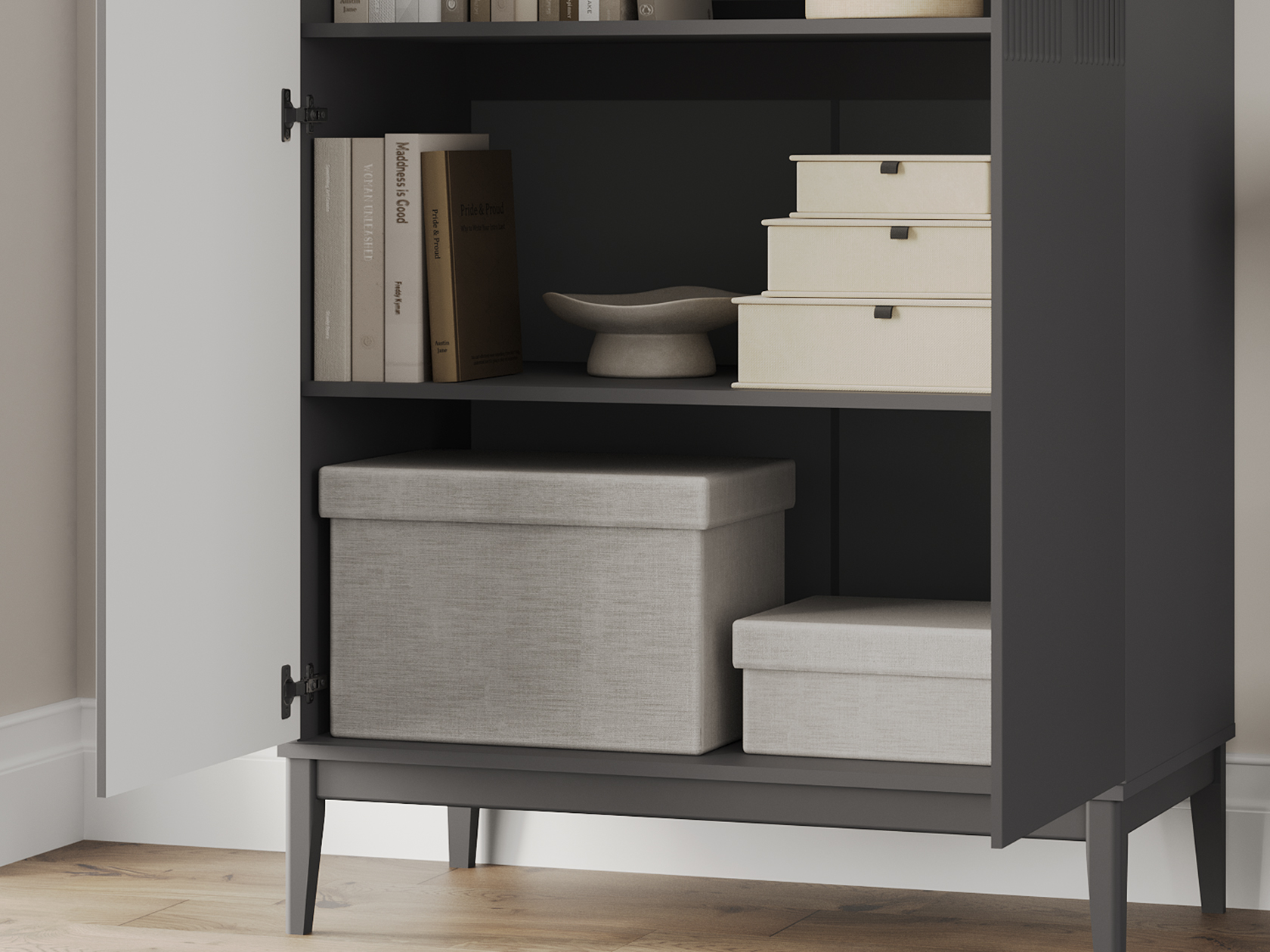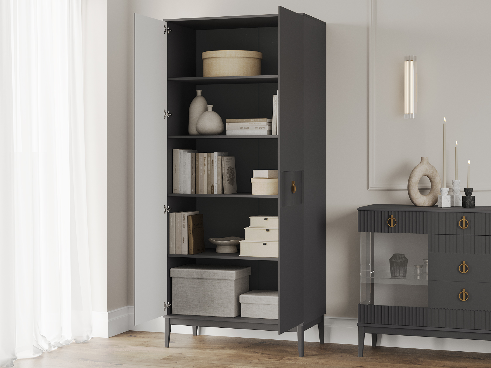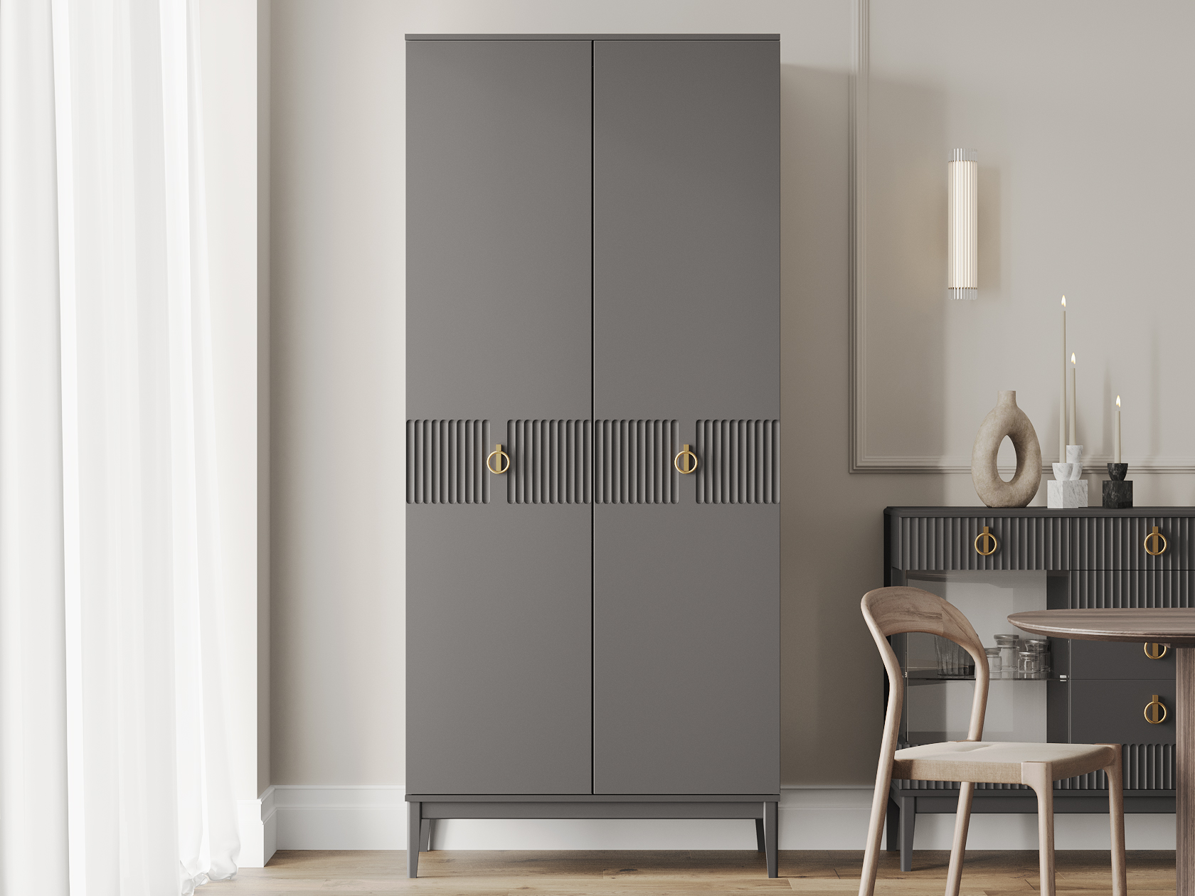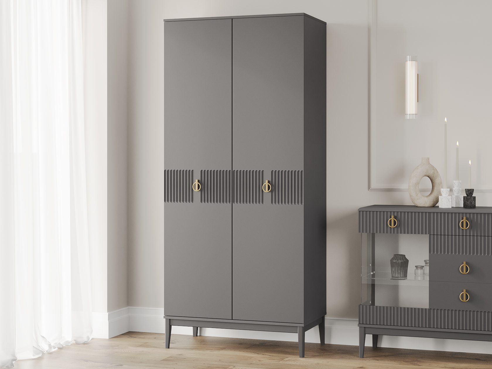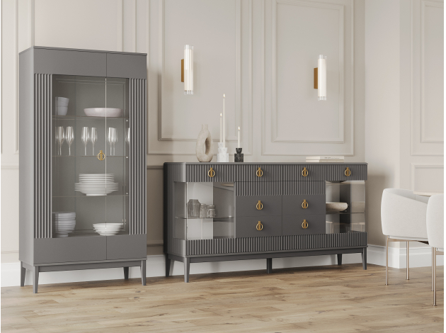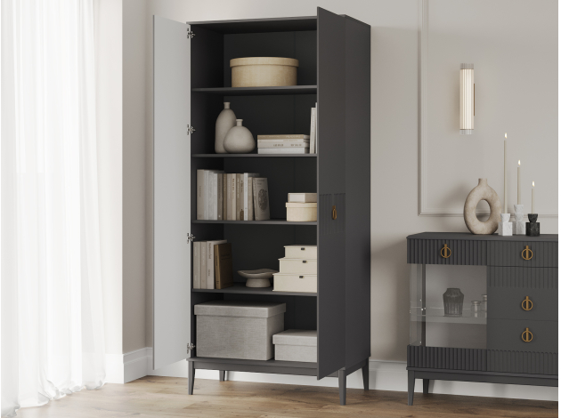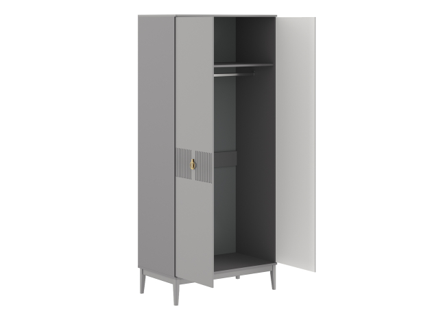Распашной шкаф Санторини расширит возможности для хранения и придаст интерьеру особый лоск. Ручки в оттенке золота делают акцент на стильной фрезеровке фасадов. В зависимости от выбранной комплектации, внутри удобно расположить одежду на вешалках либо предметы гардероба на полках.