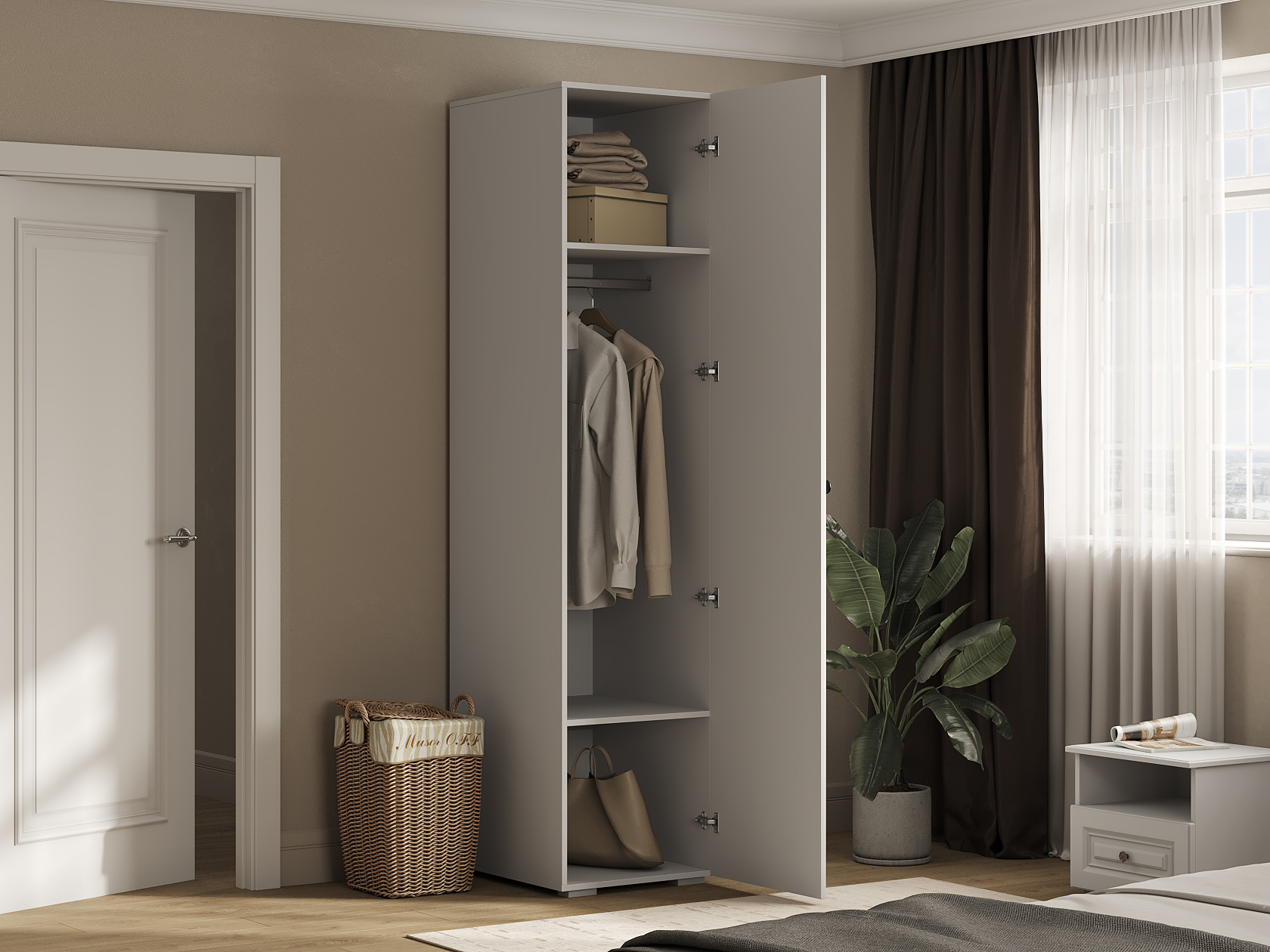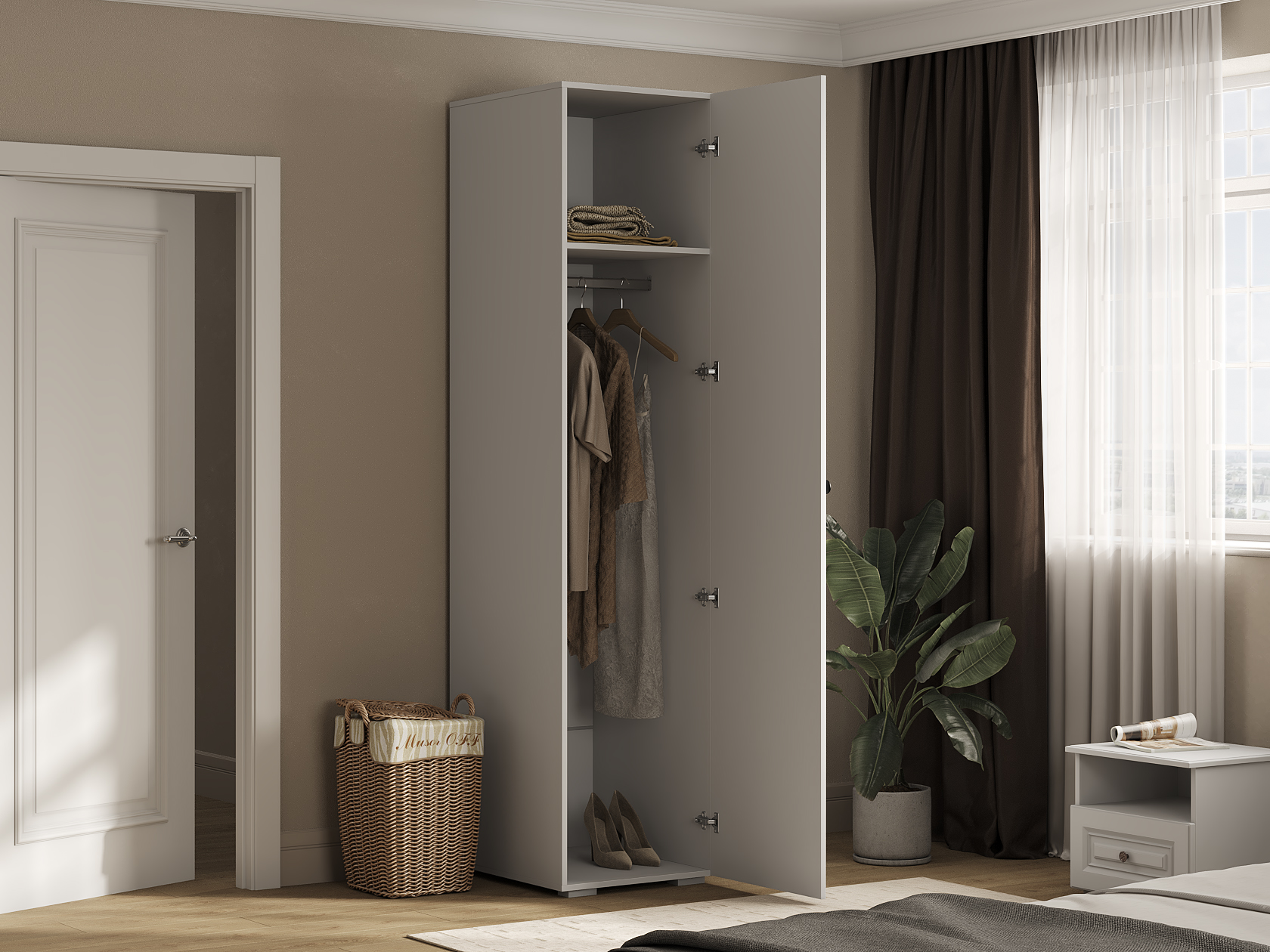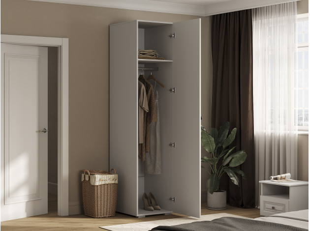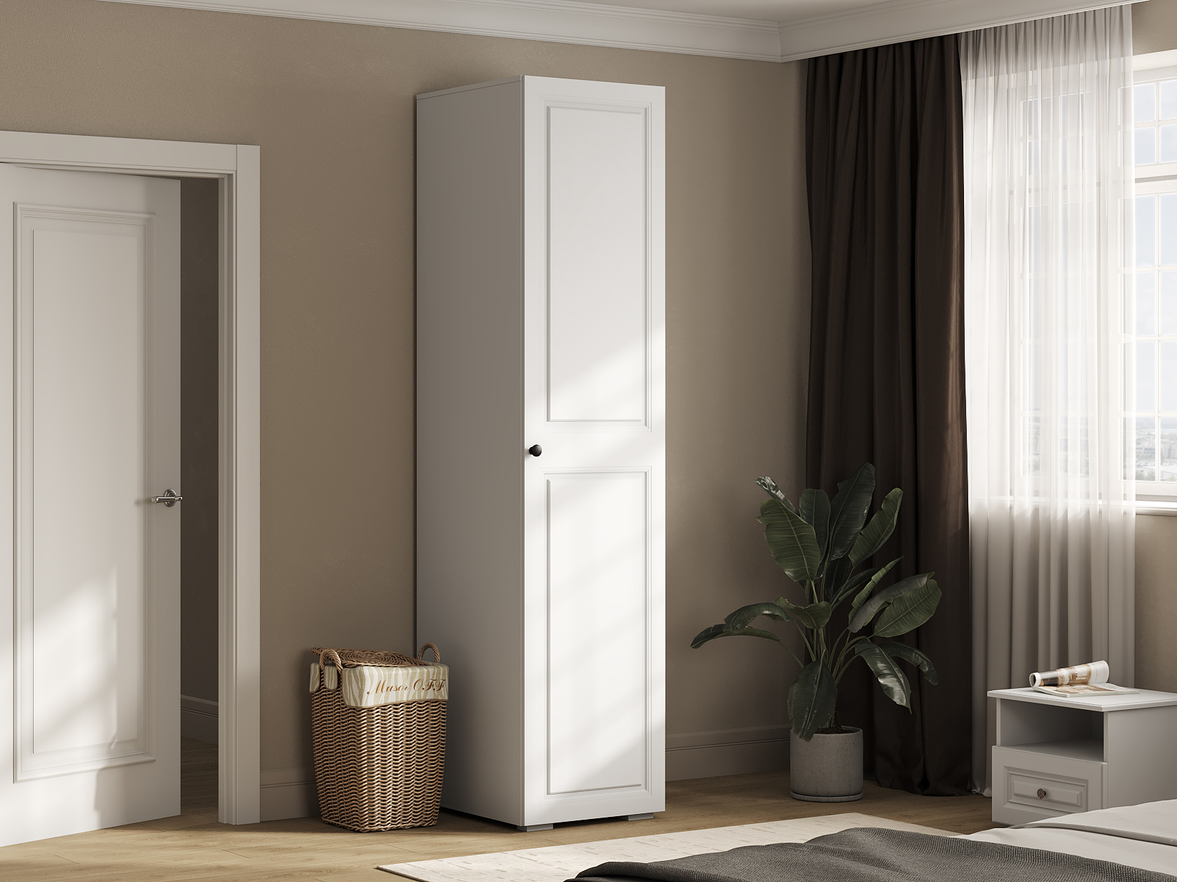 Распашной шкаф Северина организует хранение необходимых вещей без лишних затрат пространства. Дверца декорирована элегантной фрезеровкой и дополнена миниатюрной ручкой-кнопкой. Такой дизайн смотрится очень актуально и эстетично.
