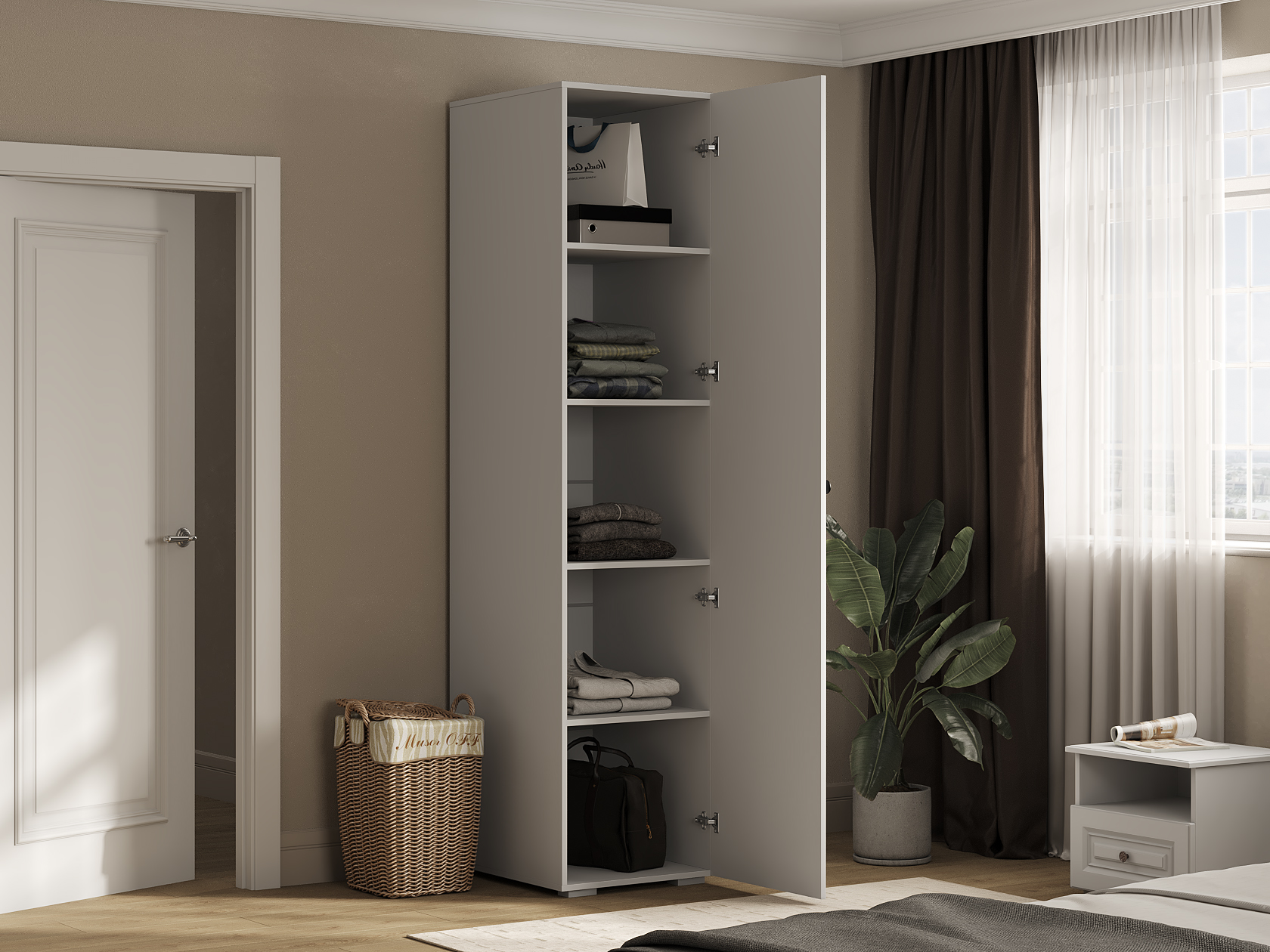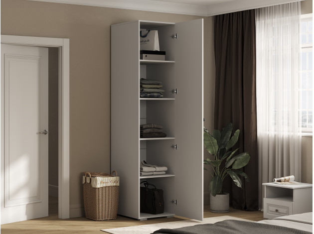 Распашной шкаф Северина организует хранение необходимых вещей без лишних затрат пространства. Дверца декорирована элегантной фрезеровкой и дополнена миниатюрной ручкой-кнопкой. Такой дизайн смотрится очень актуально и эстетично.