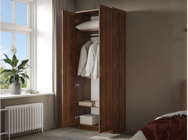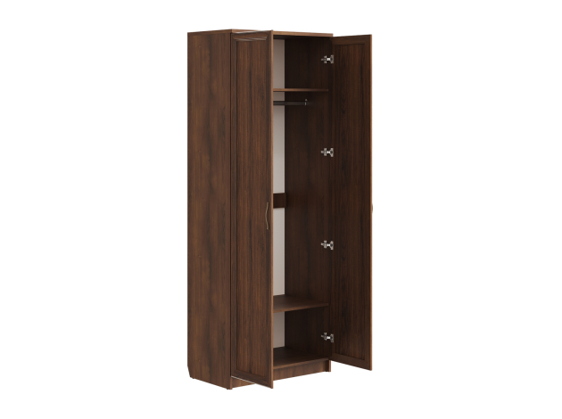 Распашной шкаф Марсель представляет собой идеальный баланс практичности и комфорта. Внутри модель оснащена штангой для вешалок и полками для удобного хранения белья и других предметов гардероба. Рамочные фасады и текстура дерева помогают создать уютную атмосферу в комнате.