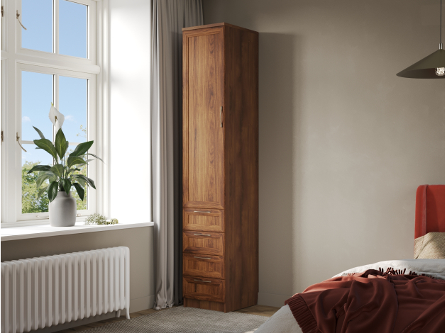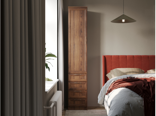Шкаф-пенал Марсель гармонично дополнит интерьер гостиной, спальни или любой другой комнаты. Модель можно использовать для хранения самых разных вещей: от белья и одежды до книг и документов. Выдвижные ящики обеспечат быстрый доступ к полезным мелочам. За фасадами легко ухаживать: неоднородная текстура дерева отлично скрывает частицы пыли и небольшие повреждения.