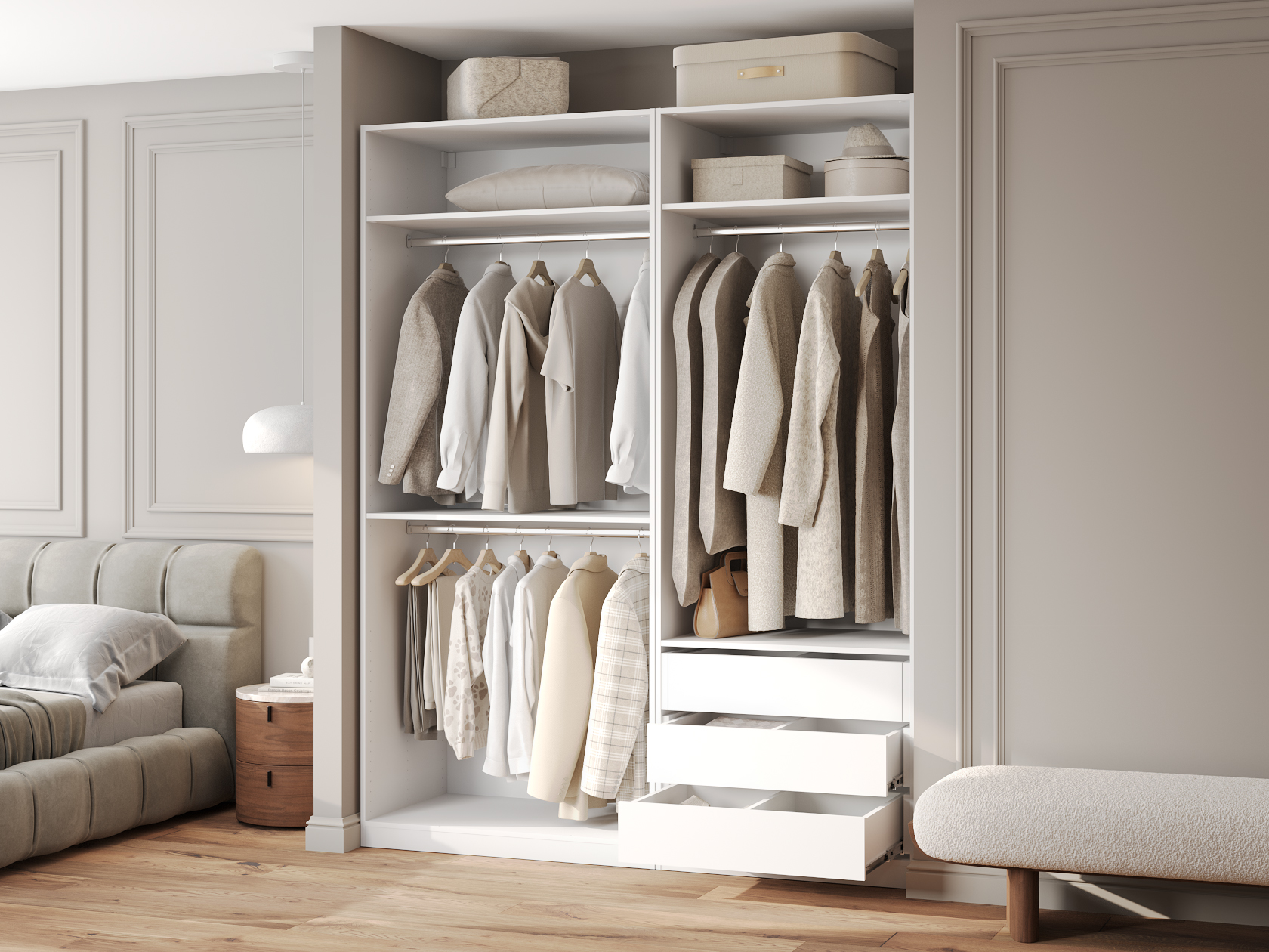 Каркас шкафа Сиена ШК-21 — компактная и прочная конструкция. Внутреннее пространство организовано двумя штангами и может быть дополнено полками и выдвижными ящиками из одноименной коллекции.
