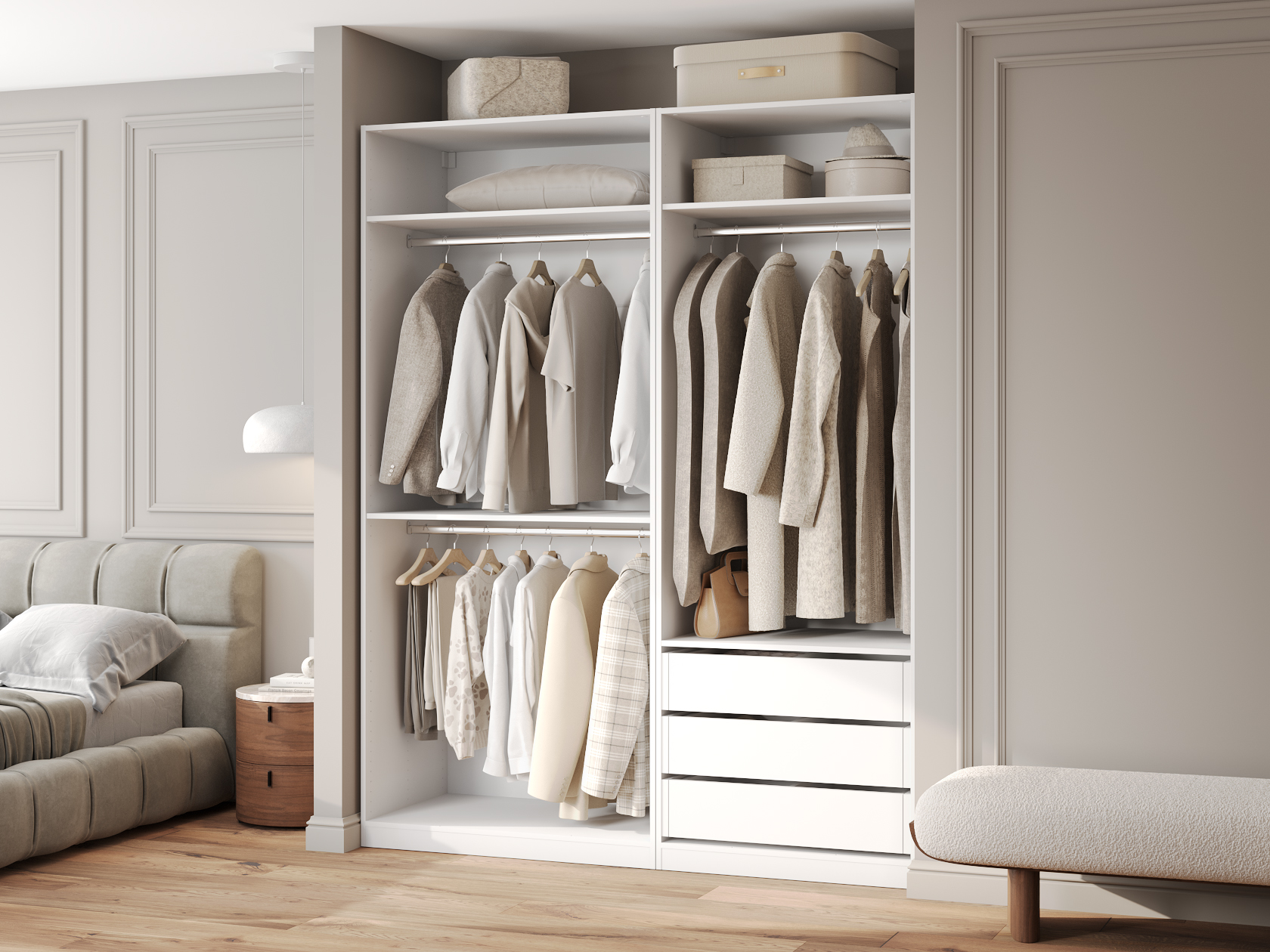 Каркас шкафа ШК-22 станет основой для формирования удобной системы хранения. Внутри предусмотрены две штанги для вешалок. При необходимости их можно дополнить полками и выдвижными ящиками из одноименной коллекции.