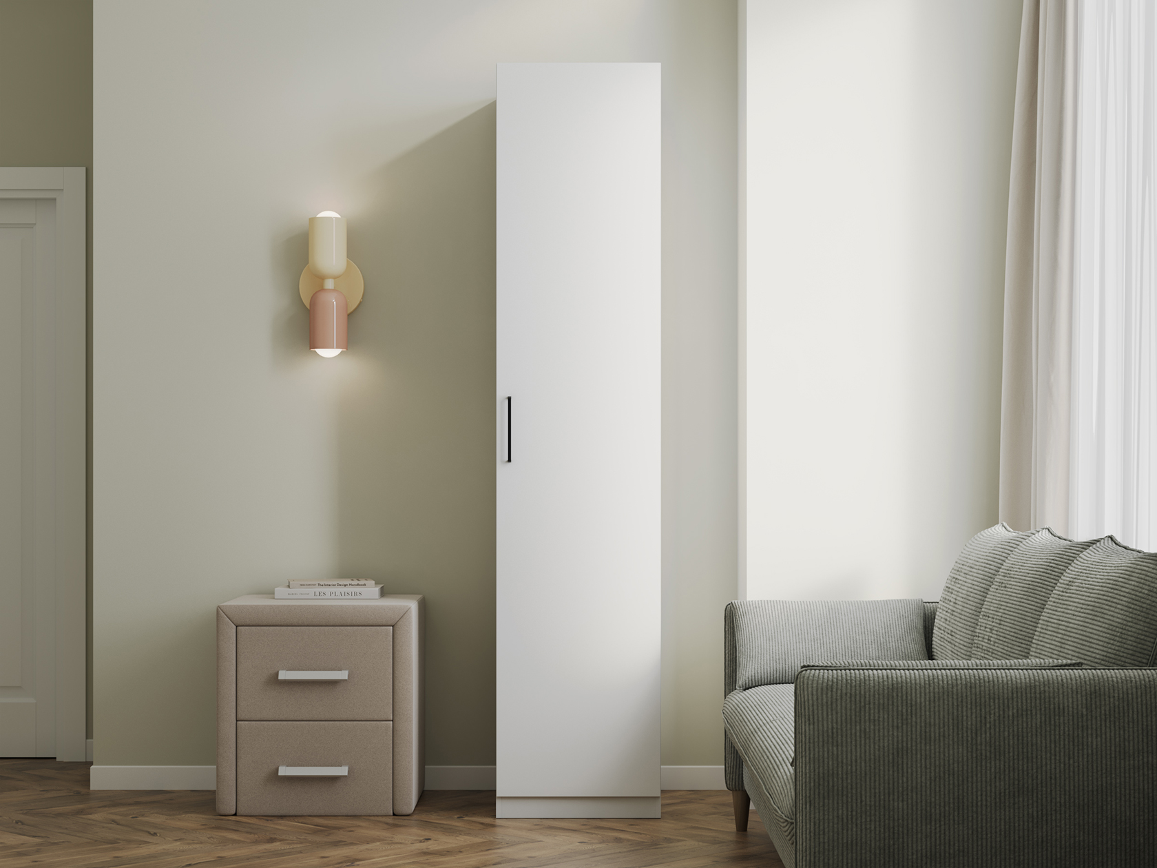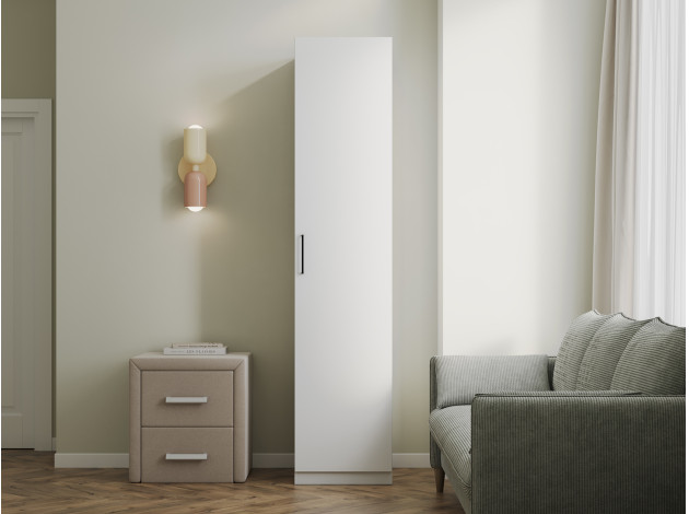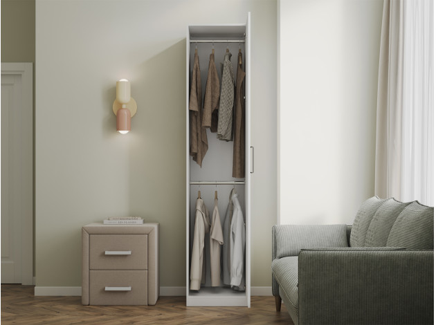 Распашной шкаф Сиена — компактная модель в минималистичном оформлении. Внутри расположены две штанги для деликатного хранения одежды на вешалках. Шкаф можно установить в небольшой спальне, детской или прихожей.