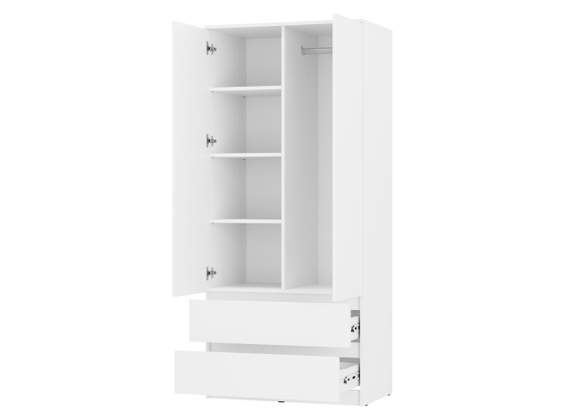 Лаконичный дизайн распашного шкафа Симпл исключает декоративные детали и лицевую фурнитуру. На полках удобно хранить текстиль и одежду в сложенном виде, а в ящиках — белье и аксессуары. Ниша со штангой позволяет аккуратно разместить платья, рубашки и костюмы. Модель может быть дополнена тумбой, которая устанавливается в качестве антресоли.