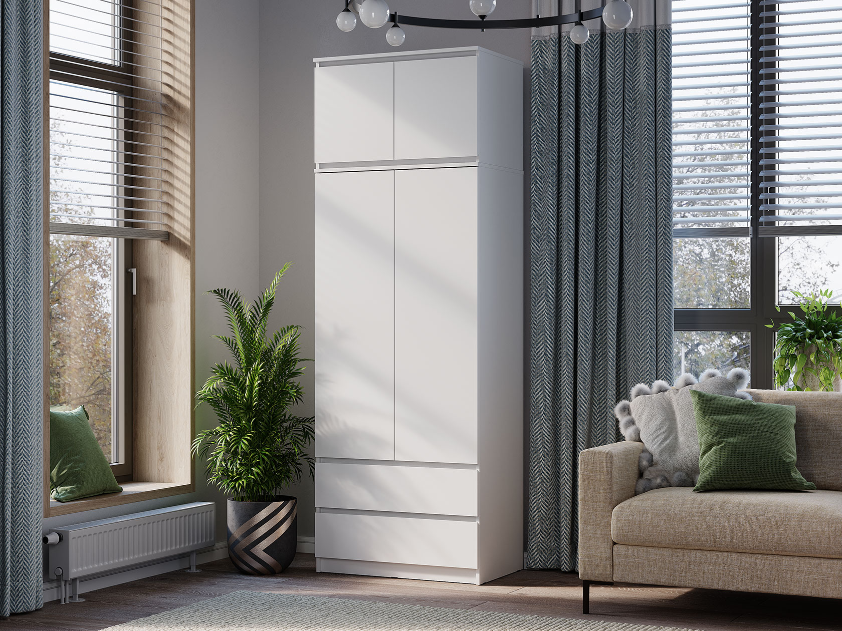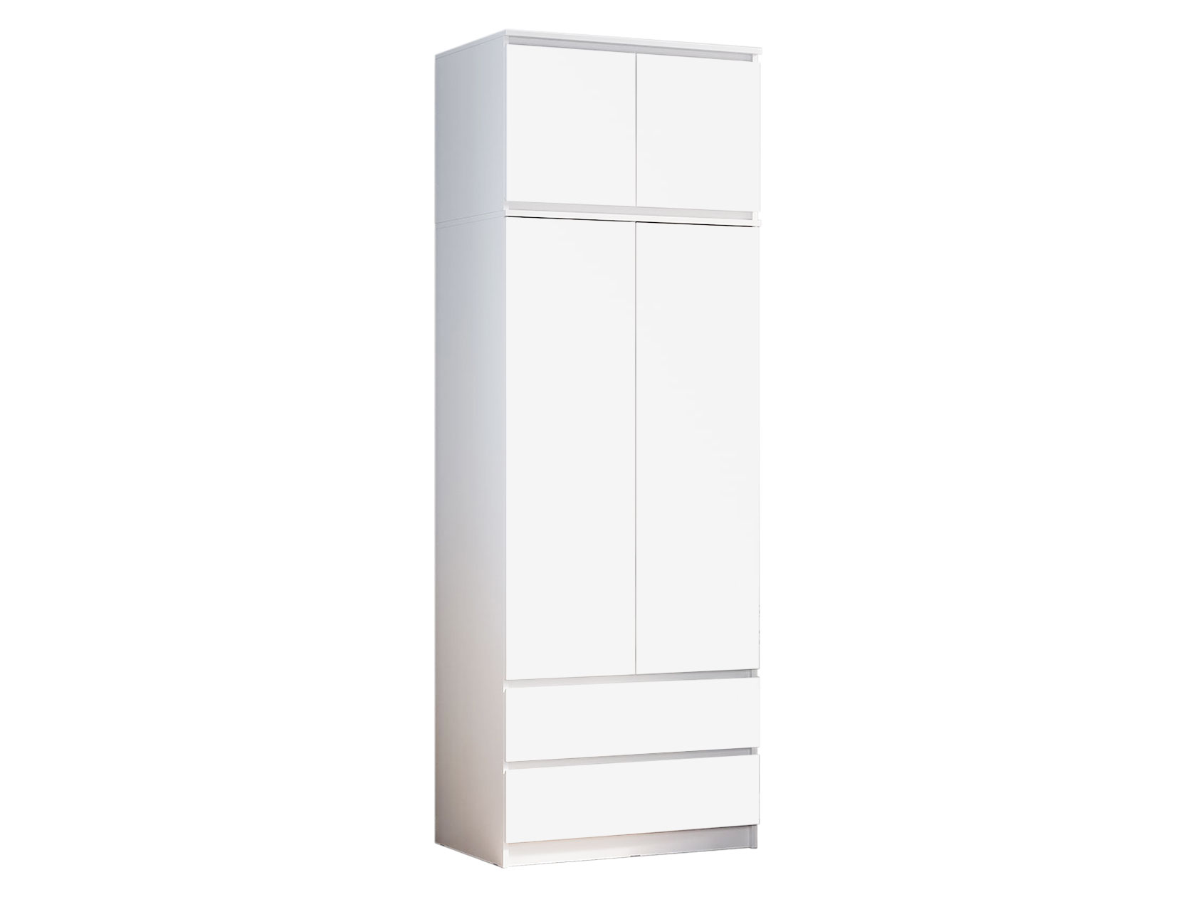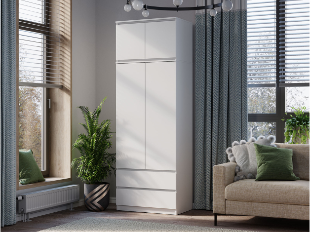 Лаконичный дизайн распашного шкафа Симпл исключает декоративные детали и лицевую фурнитуру. На полках удобно хранить текстиль и одежду в сложенном виде, а в ящиках — белье и аксессуары. Ниша со штангой позволяет аккуратно разместить платья, рубашки и костюмы. Модель может быть дополнена тумбой, которая устанавливается в качестве антресоли.