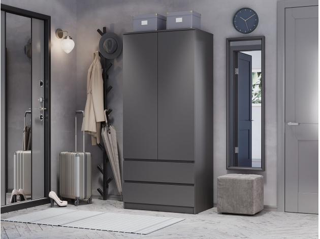 Лаконичный дизайн распашного шкафа Симпл исключает декоративные детали и лицевую фурнитуру. На полках удобно хранить текстиль и одежду в сложенном виде, а в ящиках — белье и аксессуары. Ниша со штангой позволяет аккуратно разместить платья, рубашки и костюмы. Модель может быть дополнена тумбой, которая устанавливается в качестве антресоли.