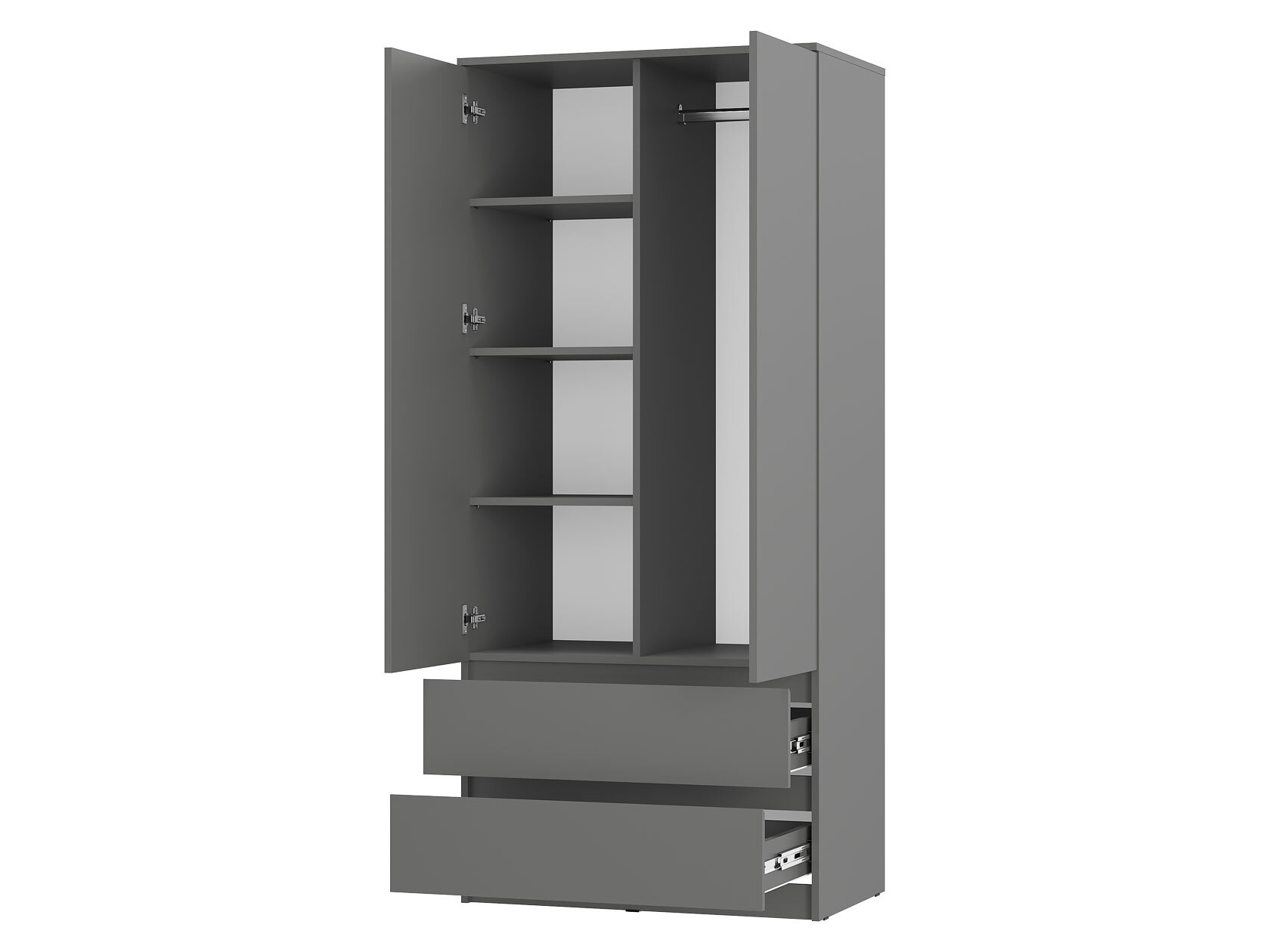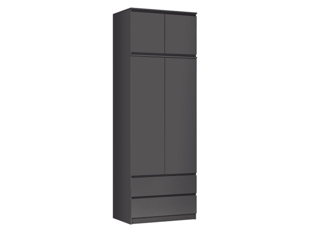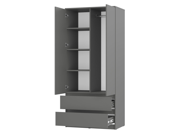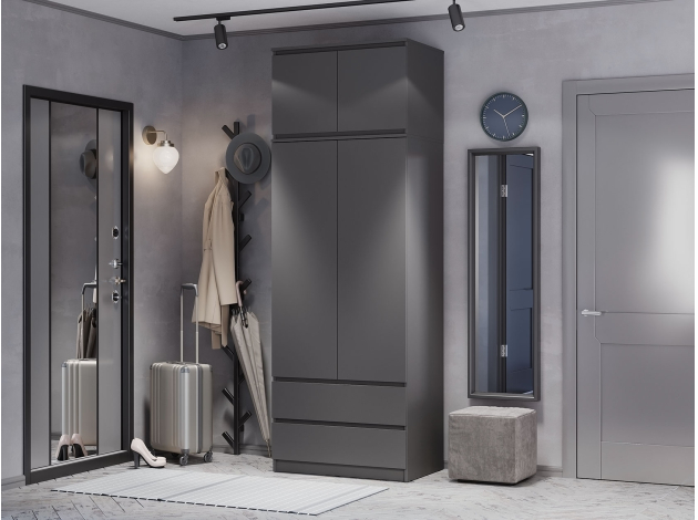 Лаконичный дизайн распашного шкафа Симпл исключает декоративные детали и лицевую фурнитуру. На полках удобно хранить текстиль и одежду в сложенном виде, а в ящиках — белье и аксессуары. Ниша со штангой позволяет аккуратно разместить платья, рубашки и костюмы. Модель может быть дополнена тумбой, которая устанавливается в качестве антресоли.