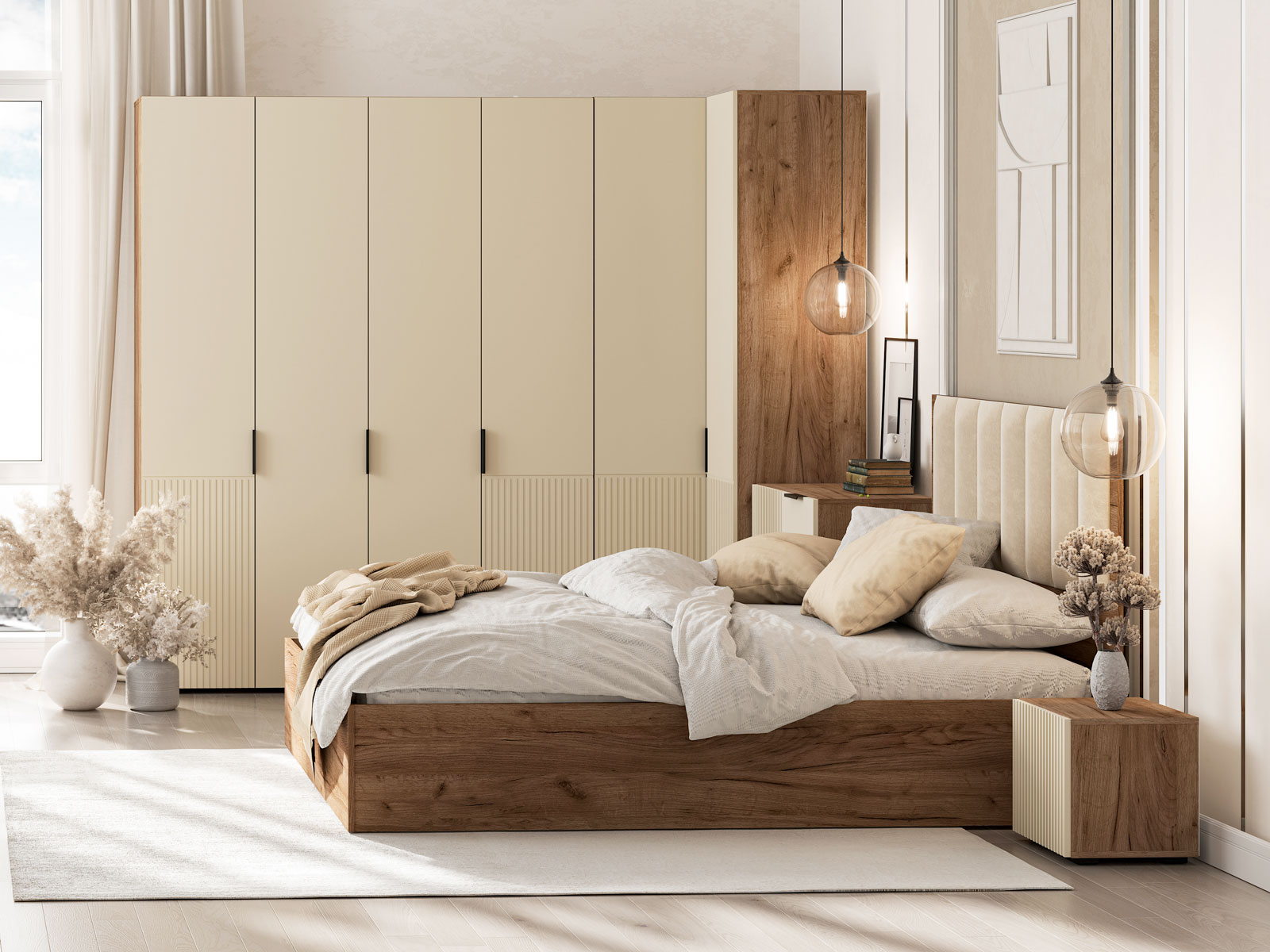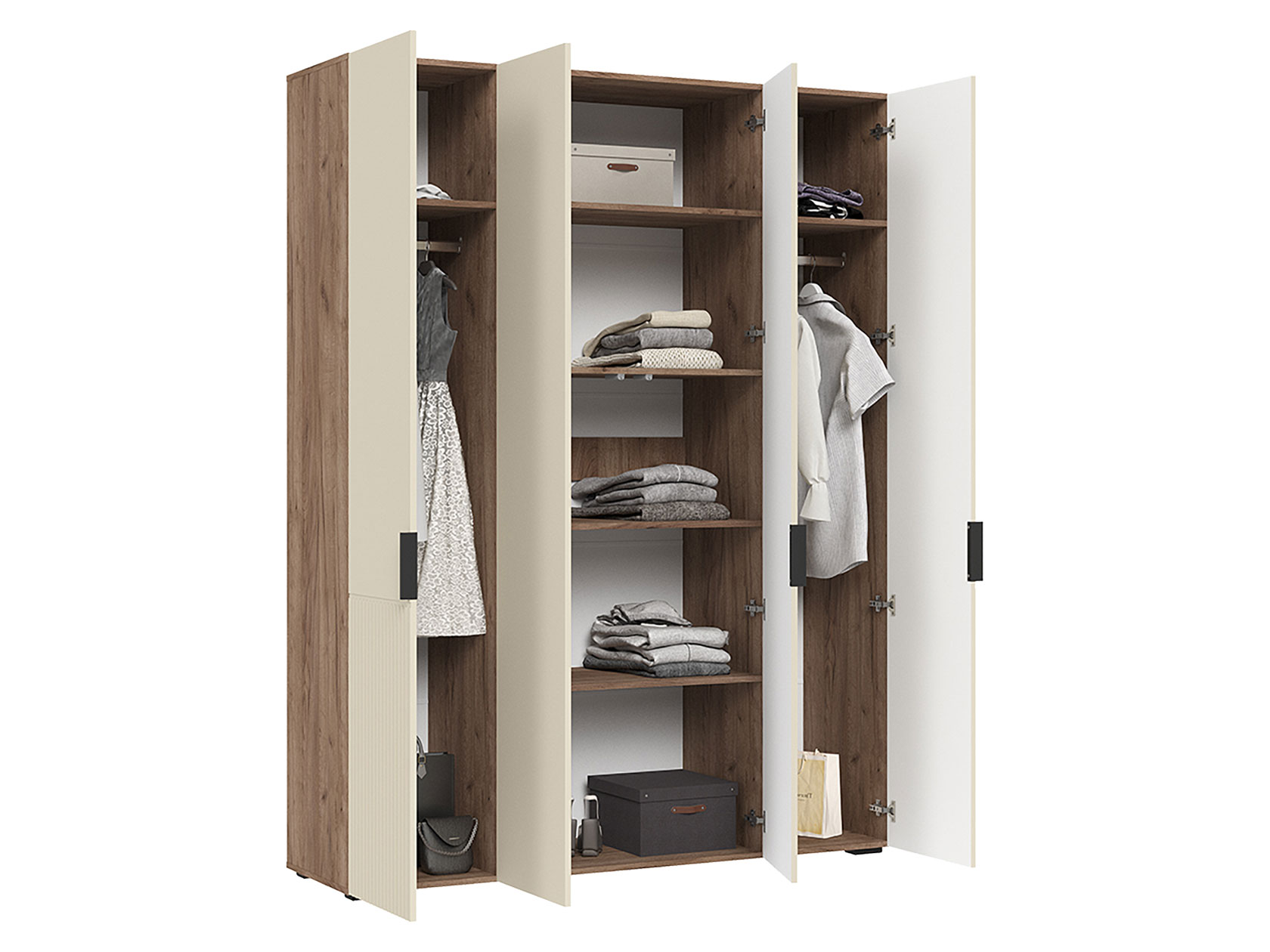 Распашной шкаф Соната 4 двери организует вместительную систему хранения, которая позволит развесить одежду на плечиках и сложить всё необходимое на полках. Антресольная секция подойдет для объемных коробок и домашнего текстиля. Гладкие матовые фасады дополнены стильной фрезеровкой и контрастными ручками. Такой дизайн актуально смотрится в сочетании с разными стилями меблировки.