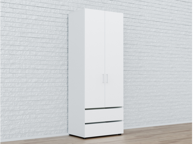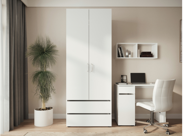 Распашной шкаф Токио подойдет тем, кто ценит практичность и сдержанный дизайн. В нише со штангой можно аккуратно развесить деликатные вещи и верхнюю одежду, а внизу удобно хранить белье, трикотаж и аксессуары. Ящики открываются за скошенный край фасадов, а дверцы — с помощью миниатюрных ручек.