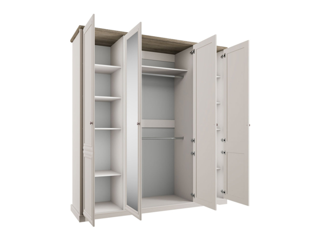 Распашной шкаф Тоскана Нью Макси — незаменимая модель для хранения гардероба. Внутри расположены ниша со штангами, где удобно развесить одежду любой длины, и полки для сложенных вещей. Фасады декорированы нежными рамками и стильными металлическими ручками, что добавляет мебели элегантности. Шкаф может быть дополнен ящиками из одноименной коллекции.