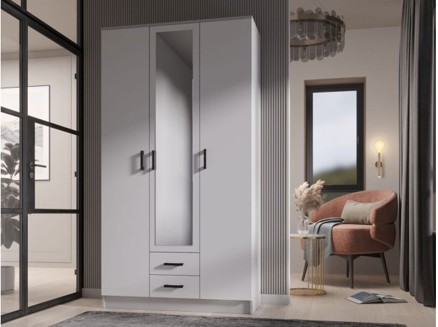 Распашной шкаф Эко Трио с зеркалом обеспечивает продуманное хранение всех предметов гардероба. Внутреннее наполнение представлено двумя секциями со штангами и нишами для сезонных вещей и головных уборов. Центральное отделение помогает разместить на полках футболки и домашние комплекты. В небольших выдвижных ящиках удобно хранить полезные мелочи. Комплектация с зеркалом позволяет в деталях оценить подобранный образ и визуально расширить пространство.