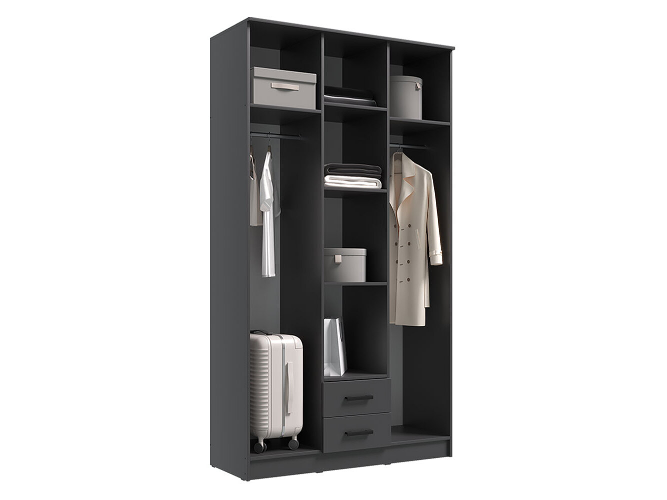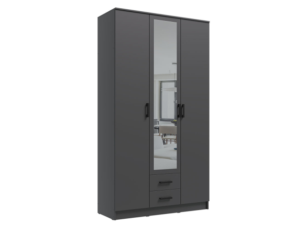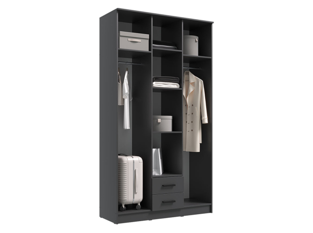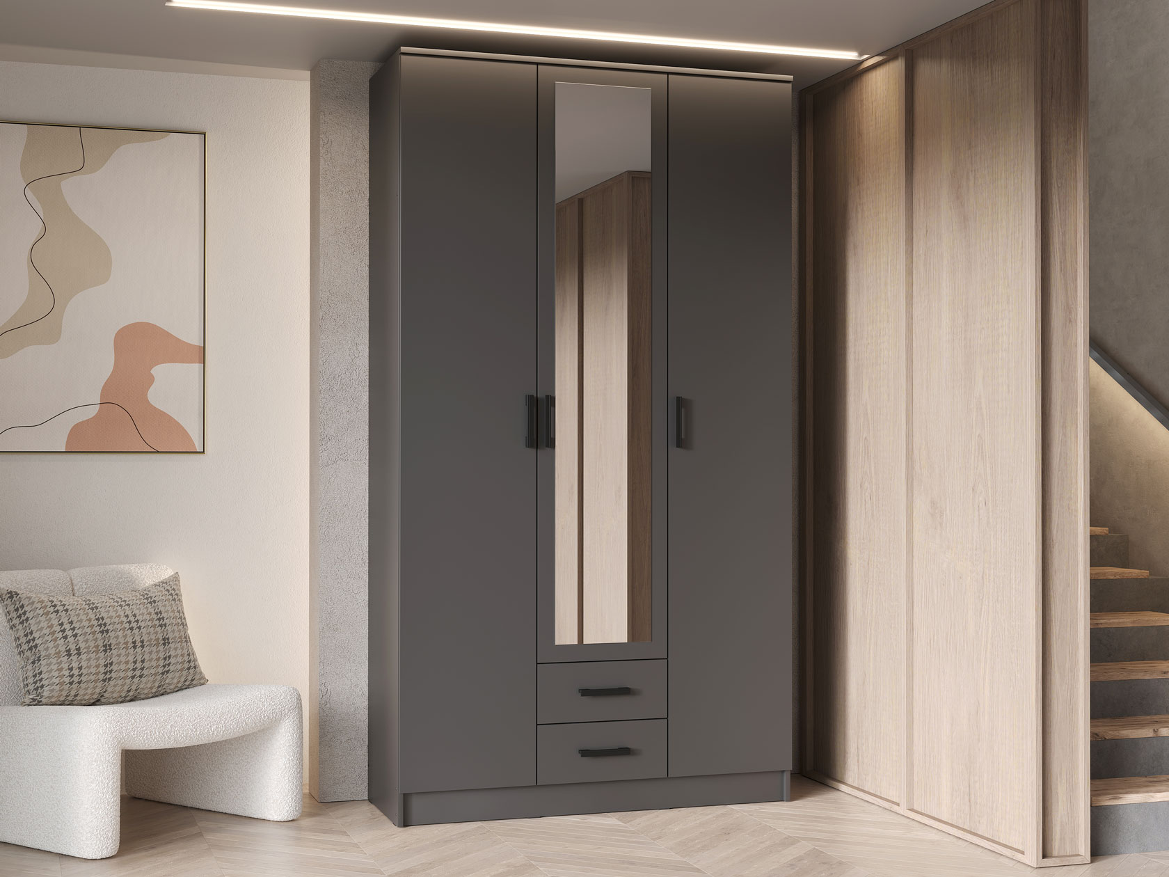 Распашной шкаф Эко Трио с зеркалом обеспечивает продуманное хранение всех предметов гардероба. Внутреннее наполнение представлено двумя секциями со штангами и нишами для сезонных вещей и головных уборов. Центральное отделение помогает разместить на полках футболки и домашние комплекты. В небольших выдвижных ящиках удобно хранить полезные мелочи. Комплектация с зеркалом позволяет в деталях оценить подобранный образ и визуально расширить пространство.