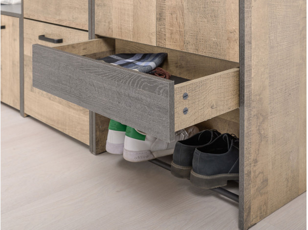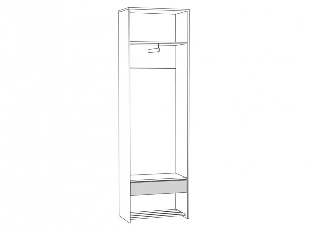Распашной шкаф Трувор — неглубокая модель для компактного хранения в интерьере прихожей. Ниша с выдвижной штангой дополнена антресольной полкой и ящиком. Съемная конструкция подставки для обуви значительно упрощает уборку: чтобы протереть пол, достаточно приподнять полку. Дверцы оснащены доводчиками, поэтому закрываются плавно и бесшумно.