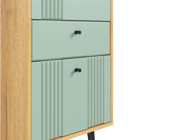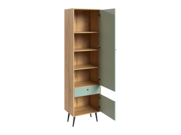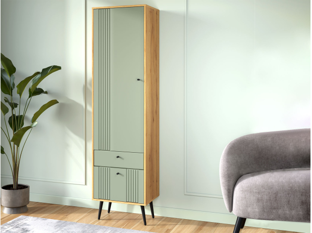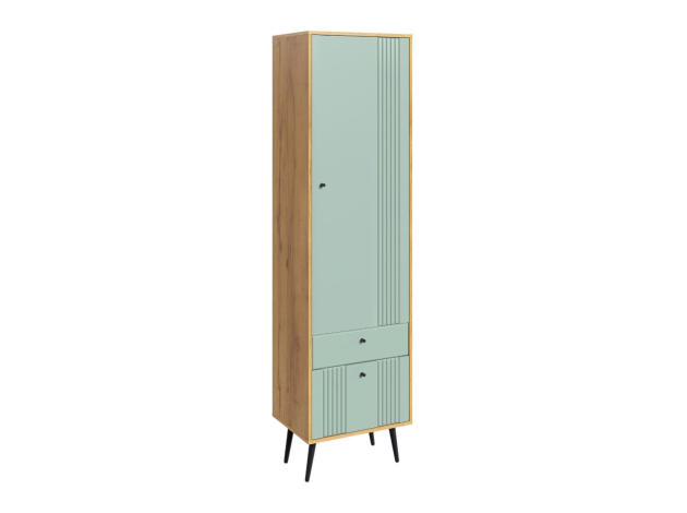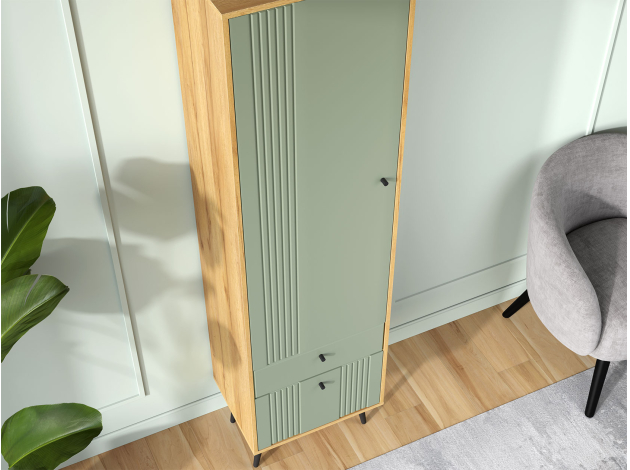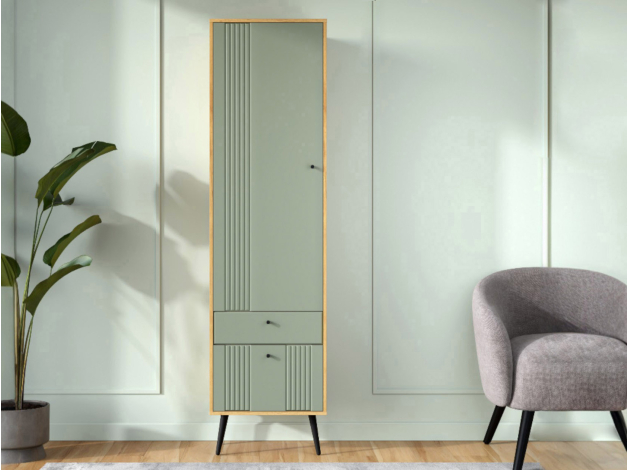 Распашной шкаф Вега Саксония сочетает удобное наполнение и современный дизайн. Внутреннее пространство отлично подходит для рационального хранения: на полках можно расставить книги, коробки с аксессуарами, вазы и другие нужные вещи, а в выдвижном ящике — держать полезные мелочи. Глухие фасады с вертикальной фрезеровкой и лаконичными ручками-кнопками не перегружают интерьер и не теряют актуальность.