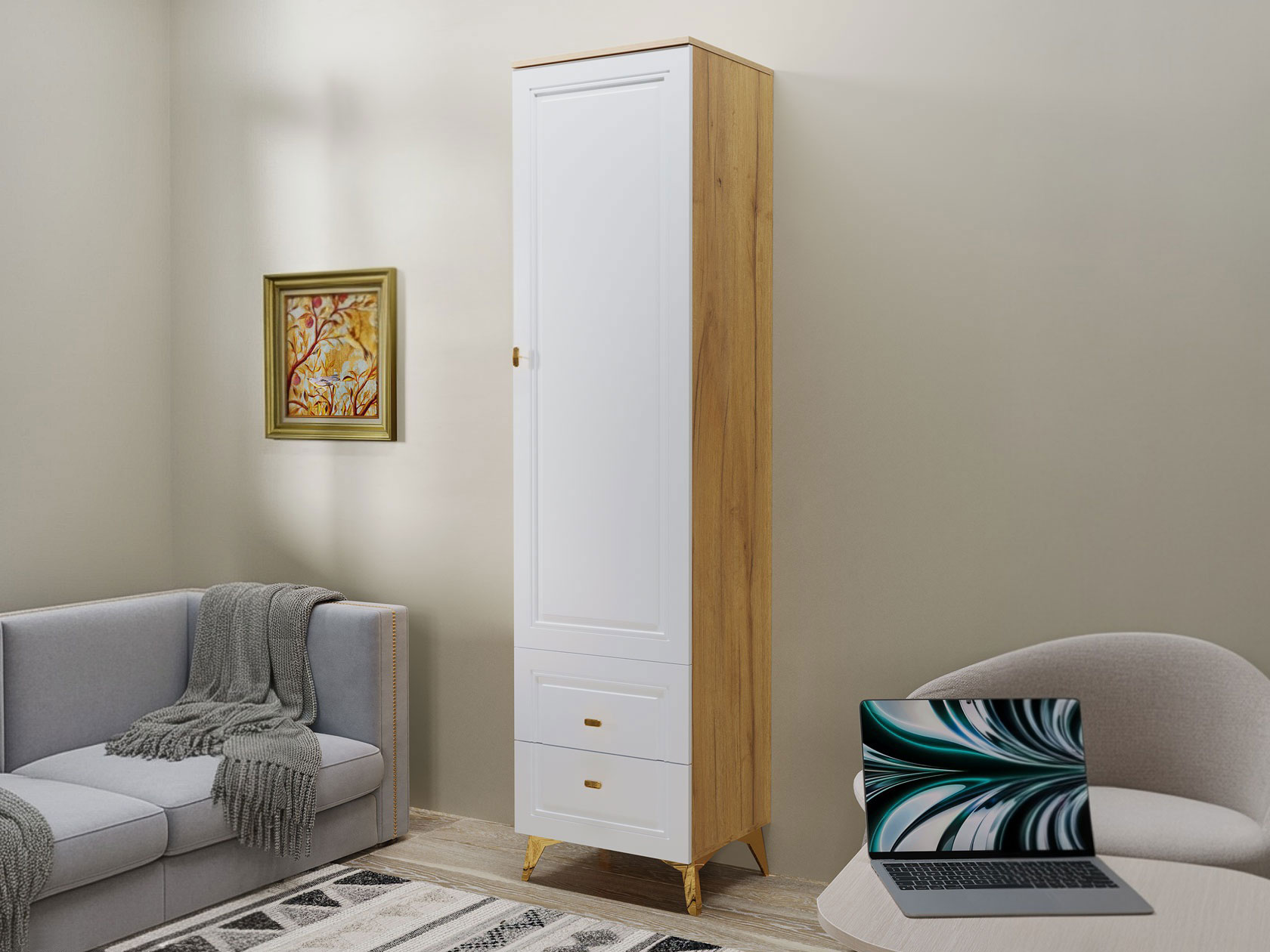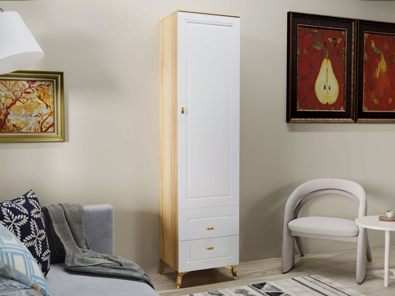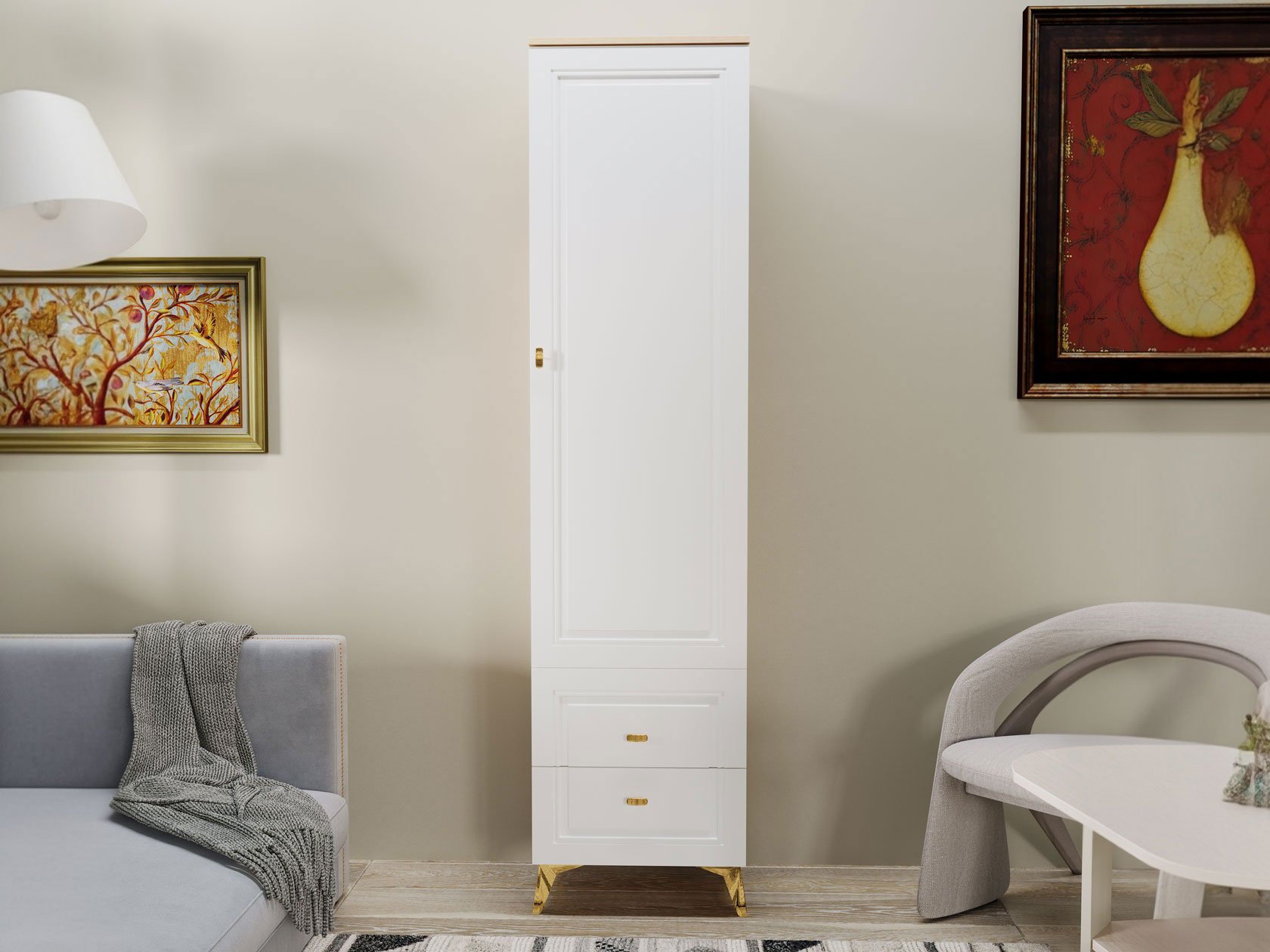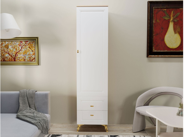 Распашной шкаф Вега Сапфир — изящное решение для интерьера гостиной. Узкая конструкция со строгими рамочными фасадами добавит эстетики и функционала даже небольшой комнате. Комплект полок и выдвижные ящики обеспечат место для предметов гардероба, аксессуаров и украшений.