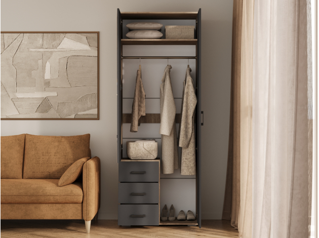 Распашной шкаф Вегас позаботится о рациональном хранении предметов гардероба. Универсальное внутреннее наполнение в виде антресольной и нижней полок, а также продольной штанги практично дополнено выдвижными ящиками. Высокое зеркальное полотно визуально расширит пространство и позволит в любой момент оценить свой внешний вид.
