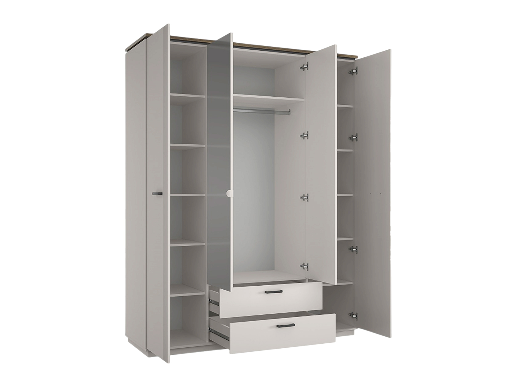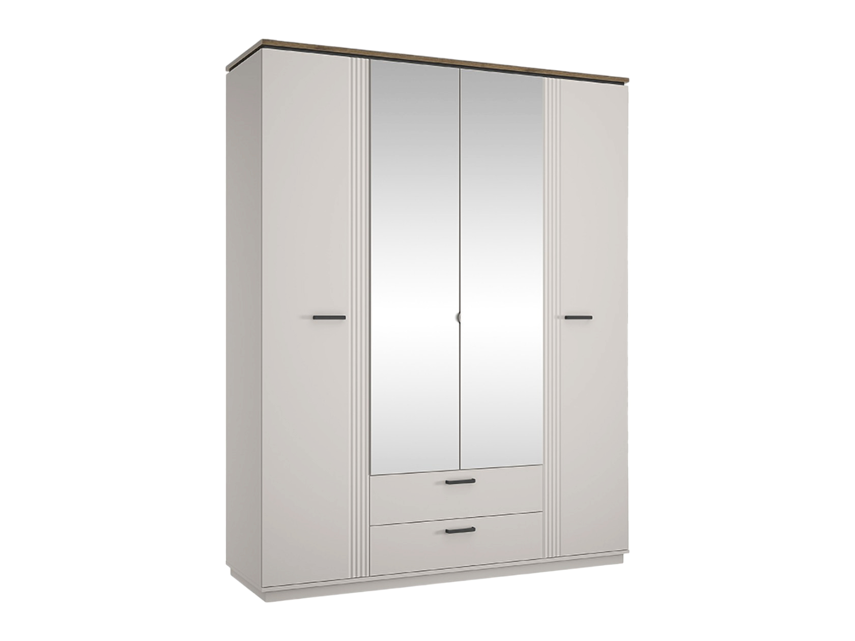 Распашной шкаф Винати 4 двери организует вместительную систему хранения. Для одежды из деликатных тканей предусмотрена ниша со штангой. Отделения с полками подходят для футболок, джинсов, постельного белья и пледов. В ящиках можно хранить полезные мелочи. Рифленая фрезеровка на фасадах создает стильные фактурные акценты, а зеркала в полный рост визуально расширяют пространство.