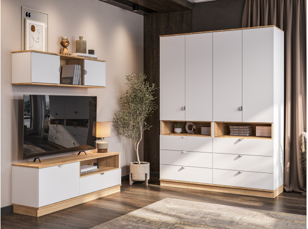 Распашной шкаф Юкка обеспечивает удобное место для хранения одежды, постельного белья, обуви и других вещей благодаря продуманному наполнению. Это практичное решение для спальни, гостиной или прихожей. Выдвижные ящики и отделение со штангой позволяют систематизировать гардероб. Лаконичный дизайн украсит любой современный интерьер.