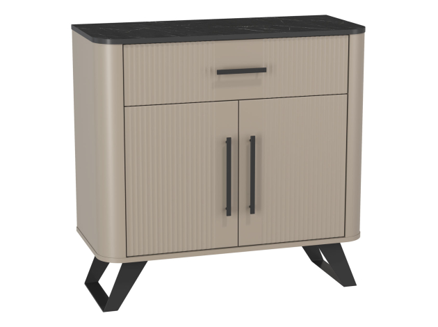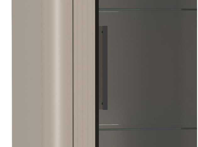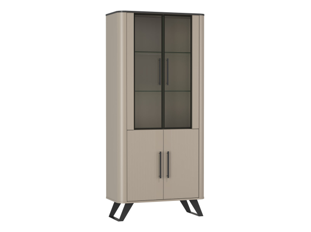 Шкаф-витрина Фиделия дополнит современный интерьер, позволяя разместить на виду коллекционные предметы. Система хранения представлена полками за стеклянными и глухими дверцами. Фасады украшены фрезеровкой в виде параллельных линий. Высокие металлические ножки гармонично сочетаются с ручками-скобами. Скругленные углы добавляют мебели безопасности и создают более плавный силуэт.