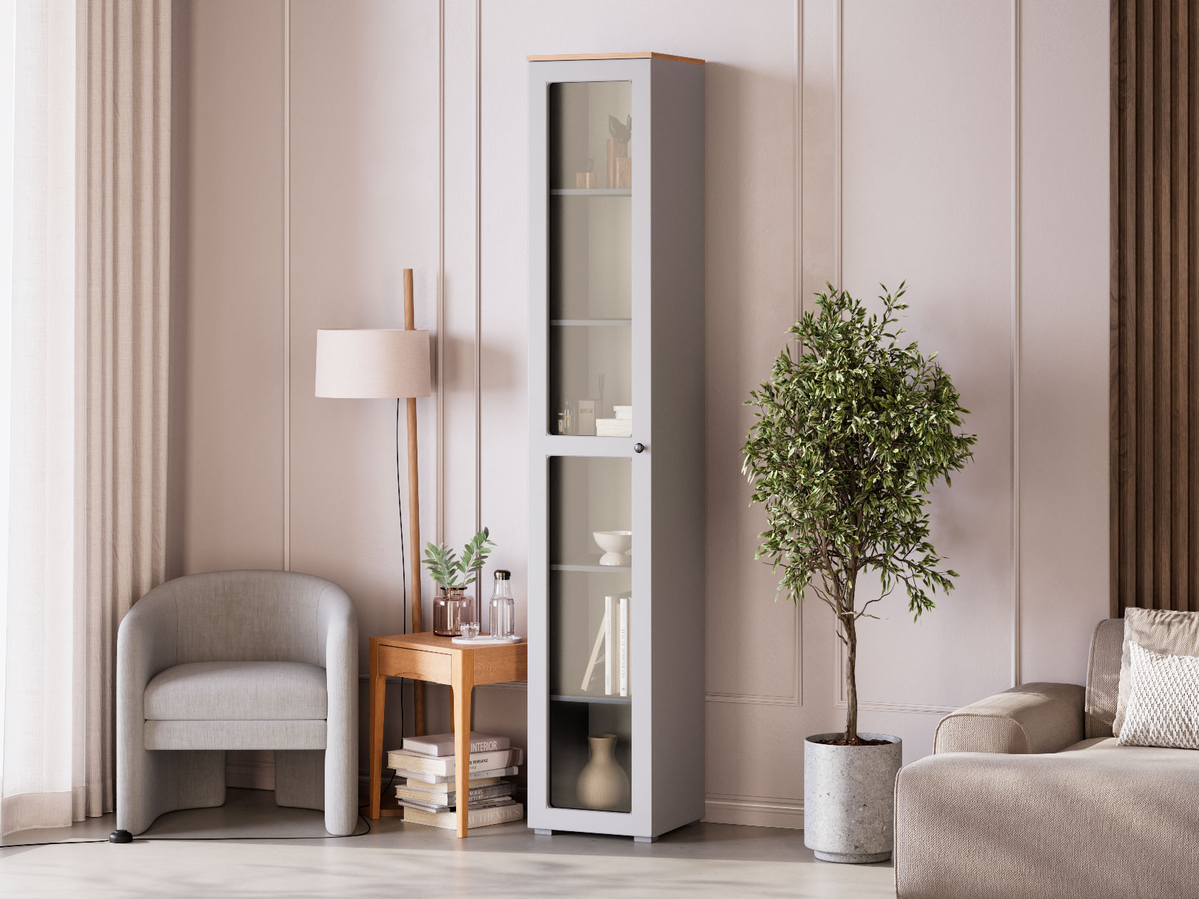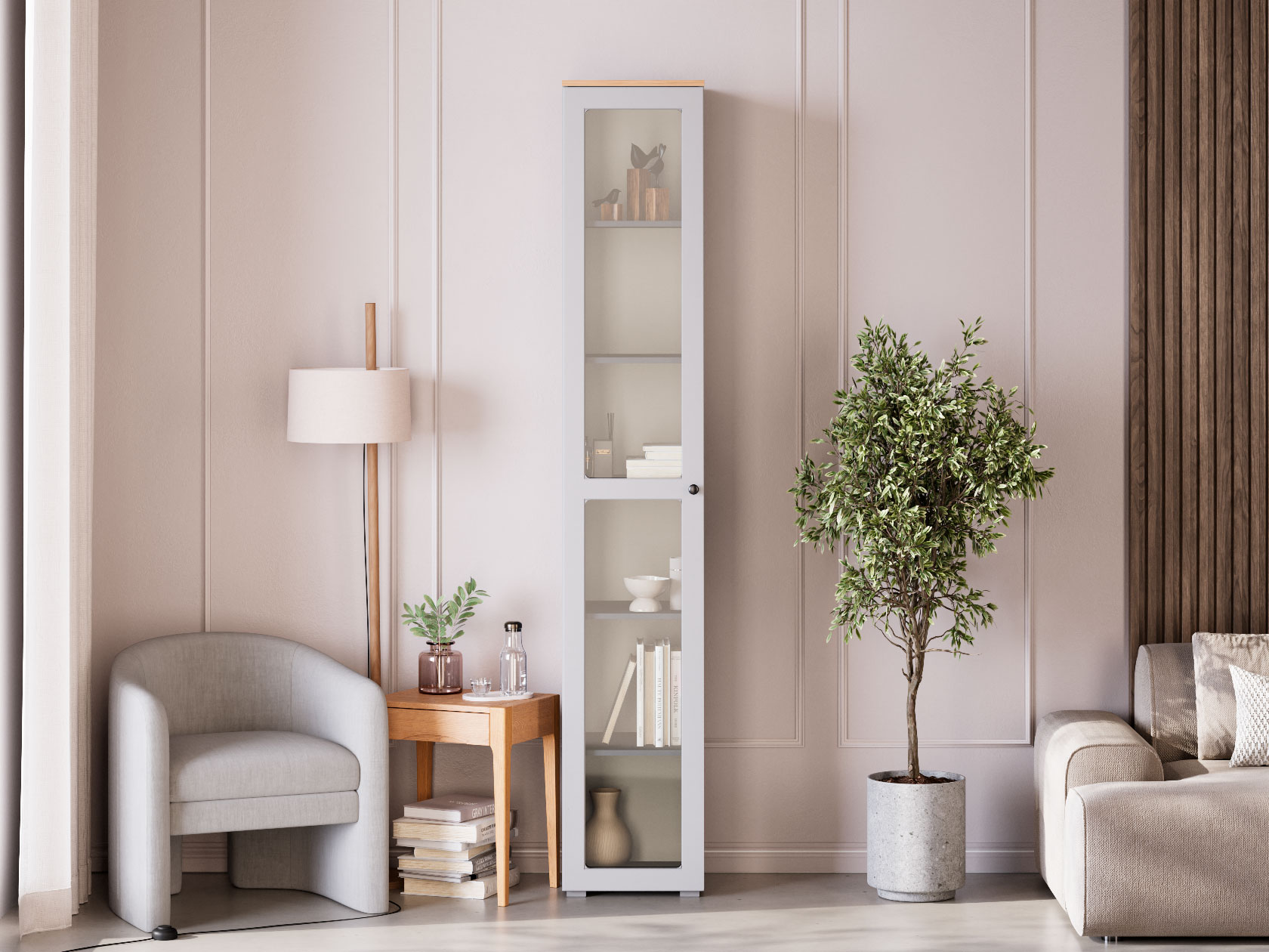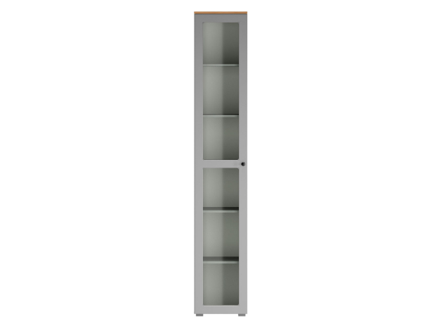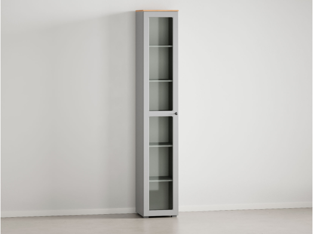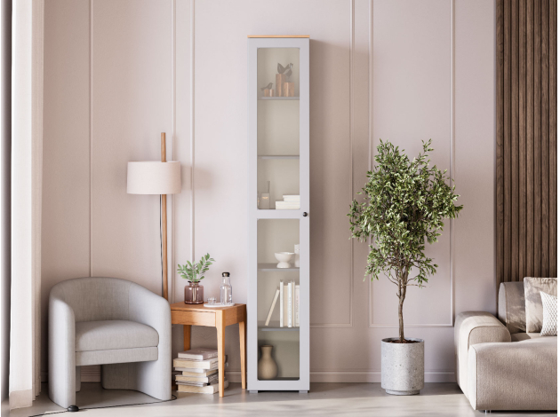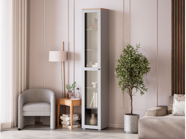Шкаф-витрина Хеминг будет уместно смотреться в гостиной или столовой. Узкая конструкция без проблем помещается даже в небольшом пространстве. Благодаря прозрачному стеклу содержимое остается на виду, но не портится от влаги и пыли. Фасад со строгой рамкой дополнен минималистичной ручкой-кнопкой. Такой дизайн легко интегрировать в разные стили интерьера.