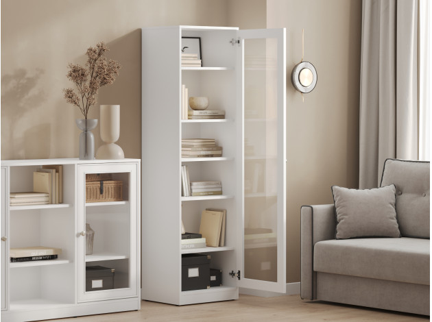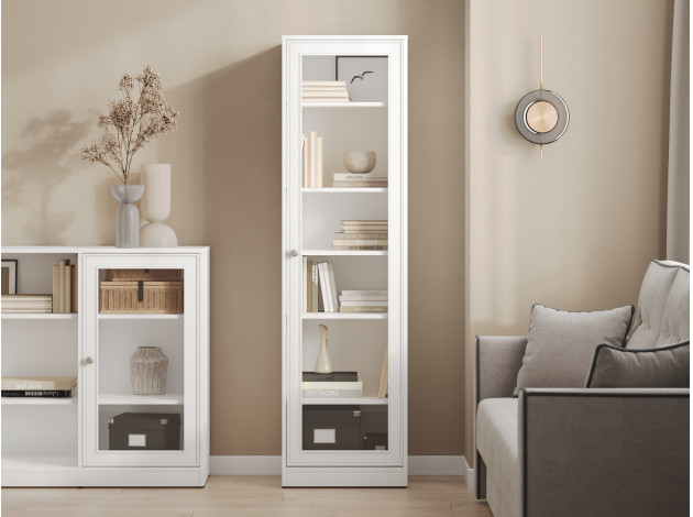 Шкаф-витрина Люси 1 дверь — практичное и стильное решение для организации домашней библиотеки. Классическое оформление с рамочными фасадами и ручками-кнопками будет уместно смотреться в рабочем кабинете, гостиной и других комнатах.