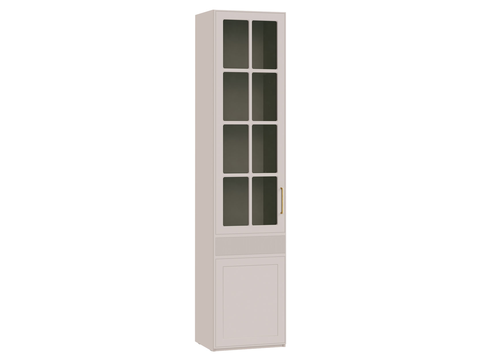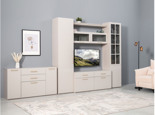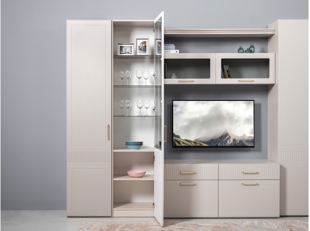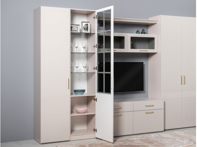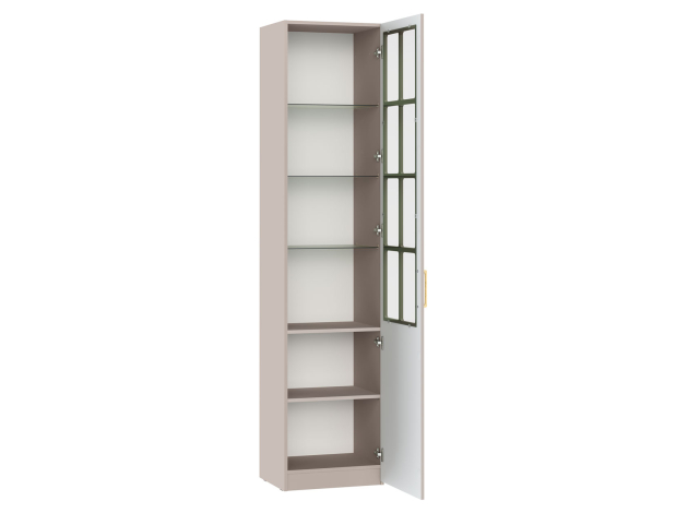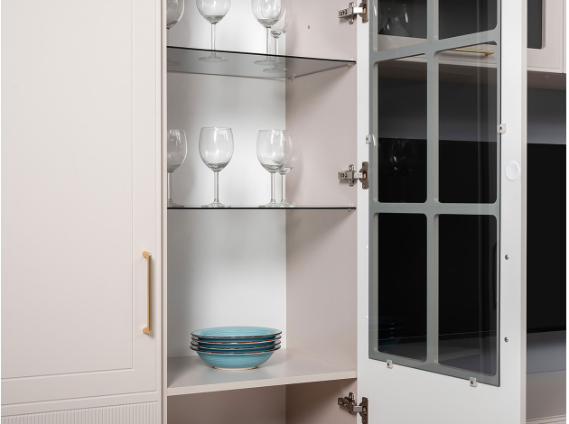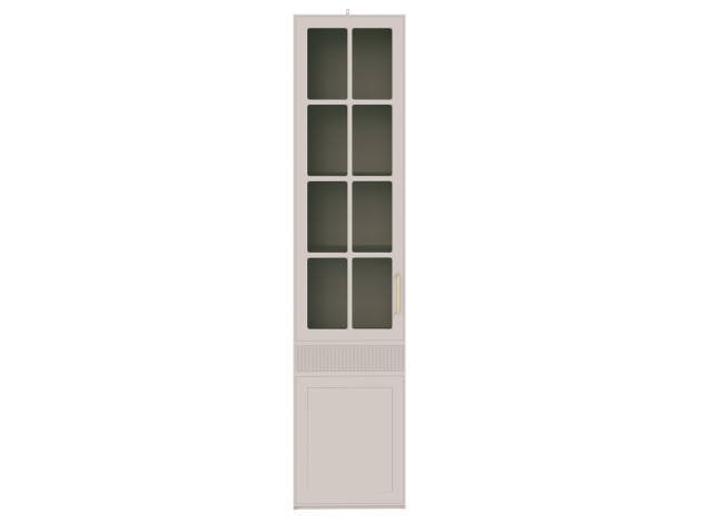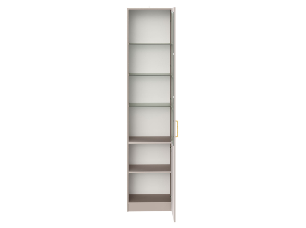 Шкаф-витрина Ричфорд станет настоящим украшением интерьера гостиной. Комбинированный фасад дополнен фрезеровкой в нижней части и лаконичной ручкой в золотистом оттенке. Высоту полок можно менять, а значит, внутреннее пространство легко адаптировать для хранения самых разных вещей: от посуды и декора до коллекции книг. Тонированное стекло защищает содержимое шкафа от УФ-лучей и пыли.