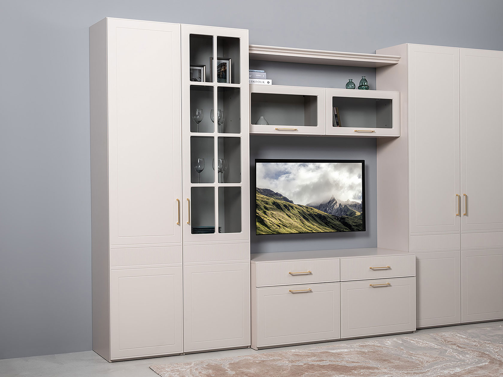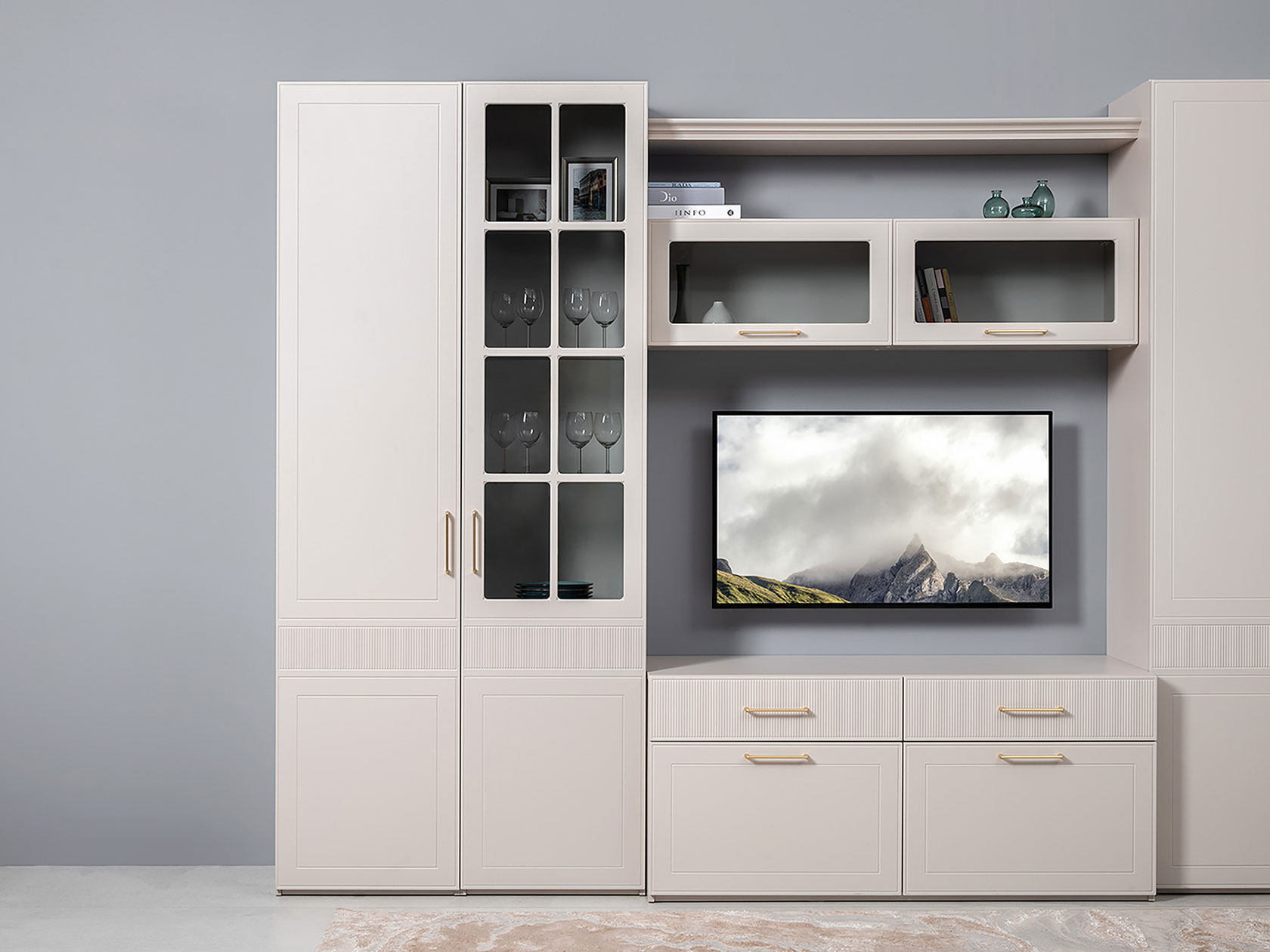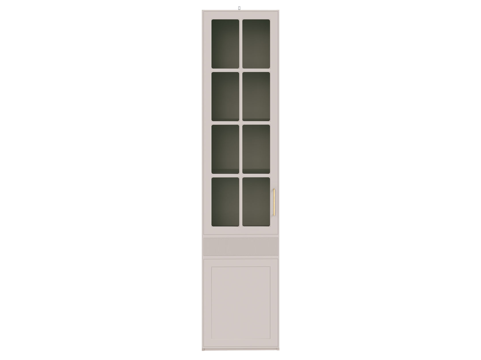 Шкаф-витрина Ричфорд станет настоящим украшением интерьера гостиной. Комбинированный фасад дополнен фрезеровкой в нижней части и лаконичной ручкой в золотистом оттенке. Высоту полок можно менять, а значит, внутреннее пространство легко адаптировать для хранения самых разных вещей: от посуды и декора до коллекции книг. Тонированное стекло защищает содержимое шкафа от УФ-лучей и пыли.