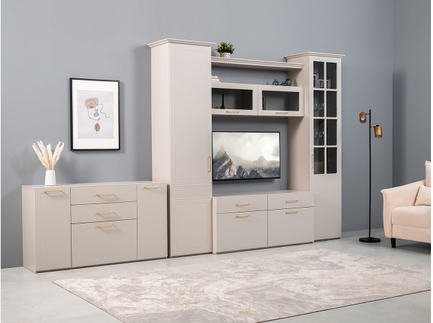 Шкаф-витрина Ричфорд станет настоящим украшением интерьера гостиной. Комбинированный фасад дополнен фрезеровкой в нижней части и лаконичной ручкой в золотистом оттенке. Высоту полок можно менять, а значит, внутреннее пространство легко адаптировать для хранения самых разных вещей: от посуды и декора до коллекции книг. Тонированное стекло защищает содержимое шкафа от УФ-лучей и пыли.