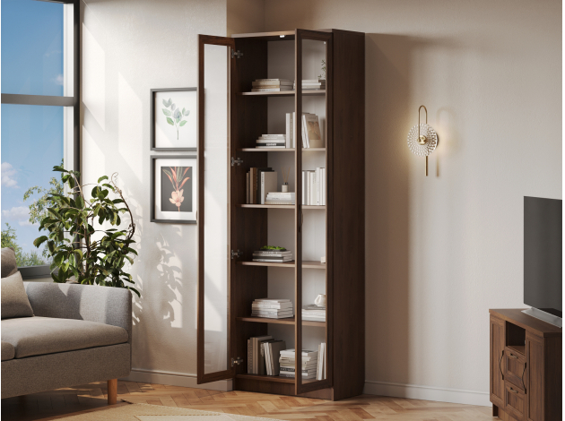 Шкаф-витрина Марсель Стандарт привлекает внимание классическим дизайном и продуманным функционалом. За фасадами из прозрачного стекла находятся полки для хранения самых разных вещей: от книг до посуды. Текстура дерева в сочетании с металлическими ручками добавляет интерьеру особые теплоту и элегантность.