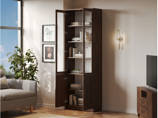 Шкаф-витрина Марсель Макси — эффектный способ разнообразить интерьер и расширить систему хранения. Стеклянные фасады позволяют продемонстрировать красивую посуду, книги и сувениры. Отделение за глухими распашными дверцами поможет скрыть содержимое от посторонних глаз. Текстура дерева, рамочные фасады и ручки в оттенке бронзы создают неповторимый облик мебели.