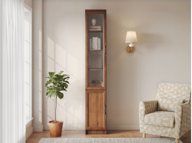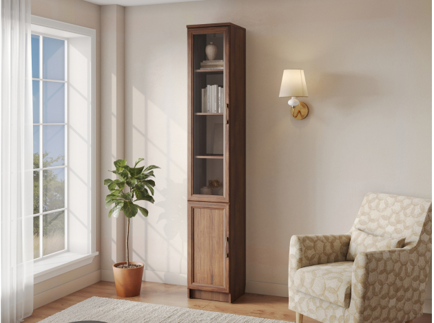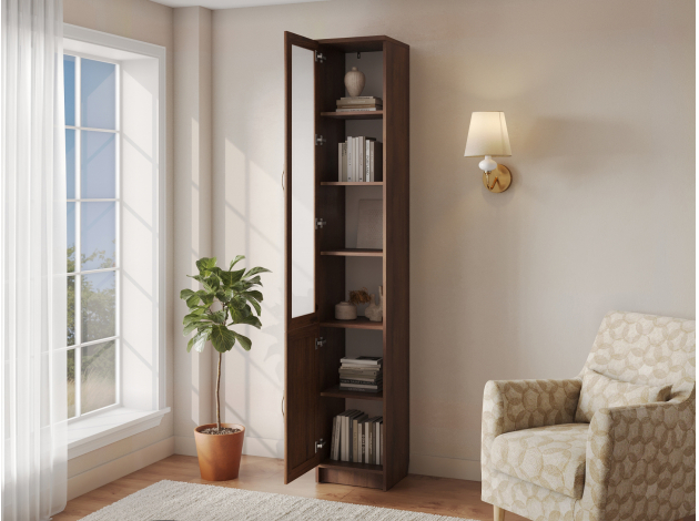 Пенал-витрина Марсель Комфорт дополнит интерьер любой комнаты, будь то гостиная, столовая или спальня. Дверца из прозрачного стекла визуально облегчает облик мебели и защищает содержимое от пыли и УФ-излучения. В закрытой секции можно хранить предметы обихода, которые необходимо скрыть от посторонних взглядов.