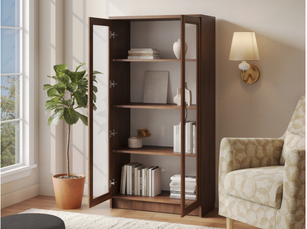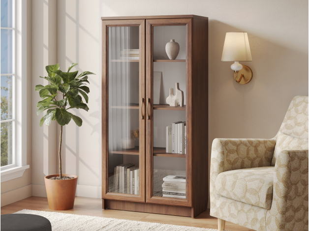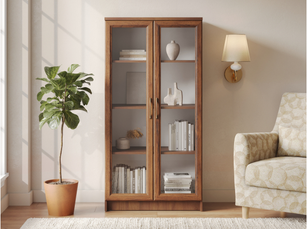 Шкаф-витрина Марсель Мини станет элегантным дополнением любой комнаты. Стеклянные дверцы добавляю интерьеру легкости, при этом защищают предметы от пыли и повреждений. Элегантные бронзовые ручки сочетаются с древесной текстурой и выступают стильным акцентом обстановки.