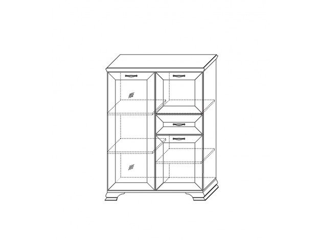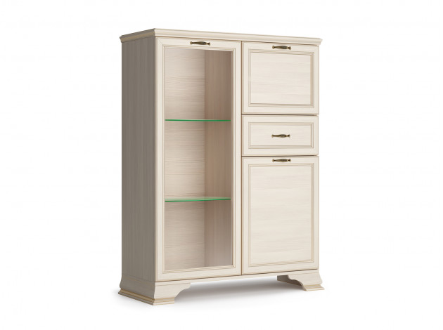 Низкий шкаф-витрина Сиена отлично дополнит интерьер гостиной, выполненной в современном стиле или прованс. Нежный цвет в сочетании с золотым патинированием и скошенными ножками придают изделию особый шарм и неповторимый вид.