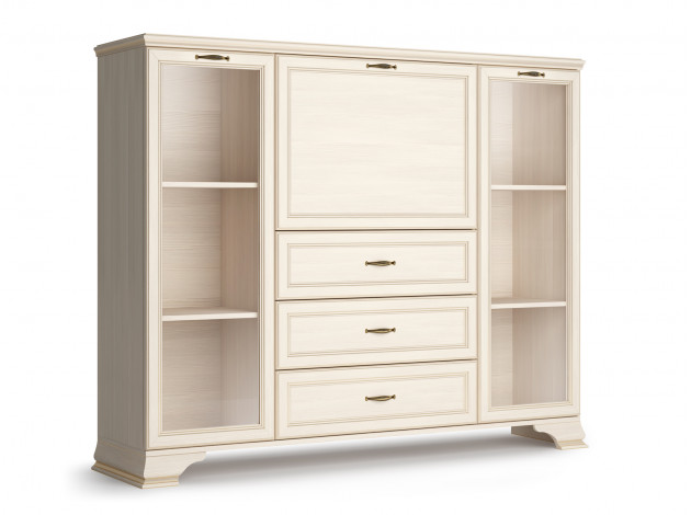Корпус выполнен из ЛДСП, опоры — МДФ. Шкаф комплектуется металлическими ручками цвет «старая бронза» и надежной крепежной фурнитурой. Петли на дверях имеют доводчики. Ящики оснащены шариковыми направляющими.