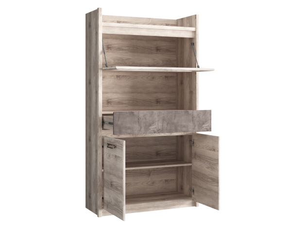 - функциональное наполнение — благодаря нескольким полкам, закрытым нишам и выдвижному ящику, модель позволит с легкостью разместить множество нужных вещей;