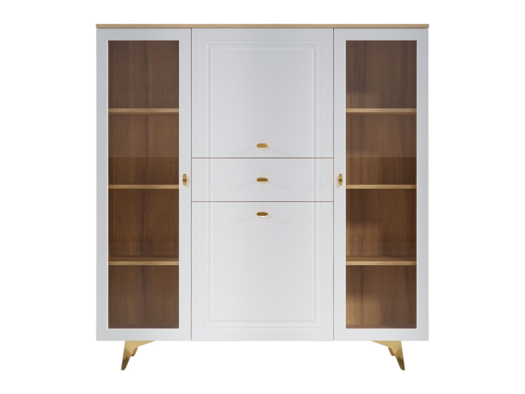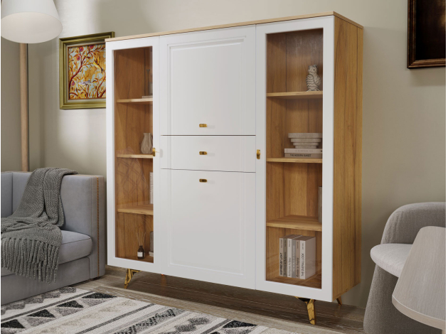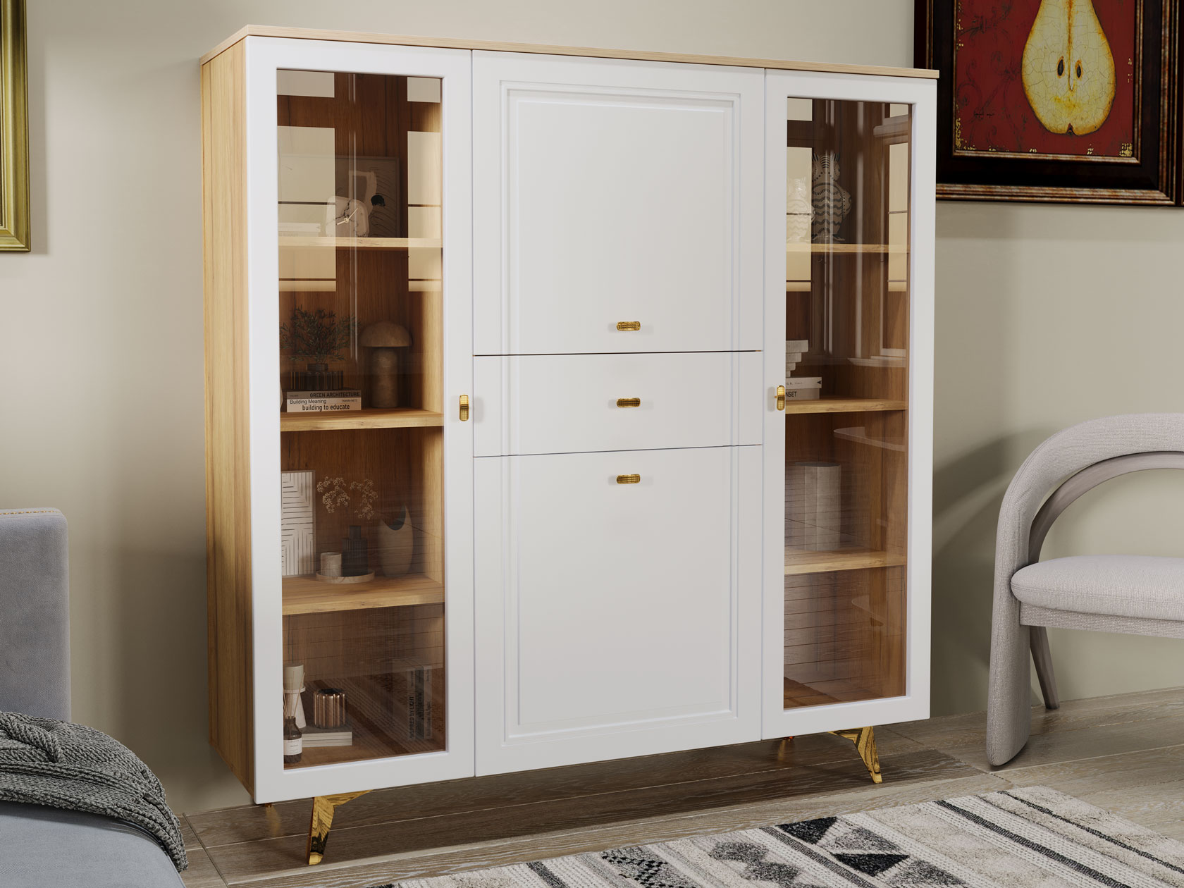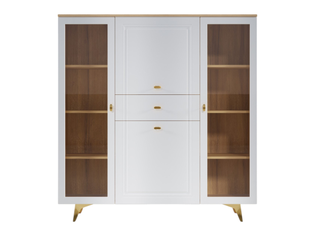 Шкаф-витрина Вега Сапфир 2 стеклодвери дополнит интерьер любой комнаты, расширив систему хранения. Симметрично расположенные прозрачные дверцы визуально облегчают облик модели и позволяют продемонстрировать красивую посуду, декор и редкие книги. Небольшие акцентные ножки в цвет фурнитуры — изюминка дизайна.