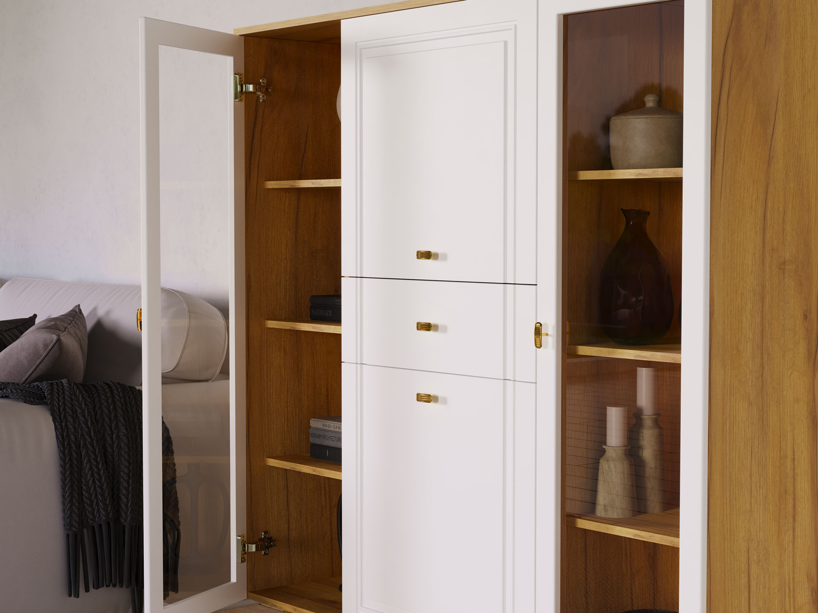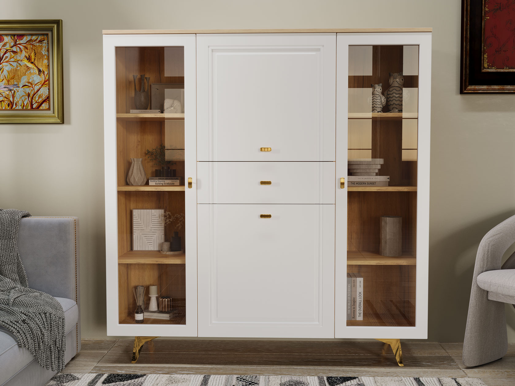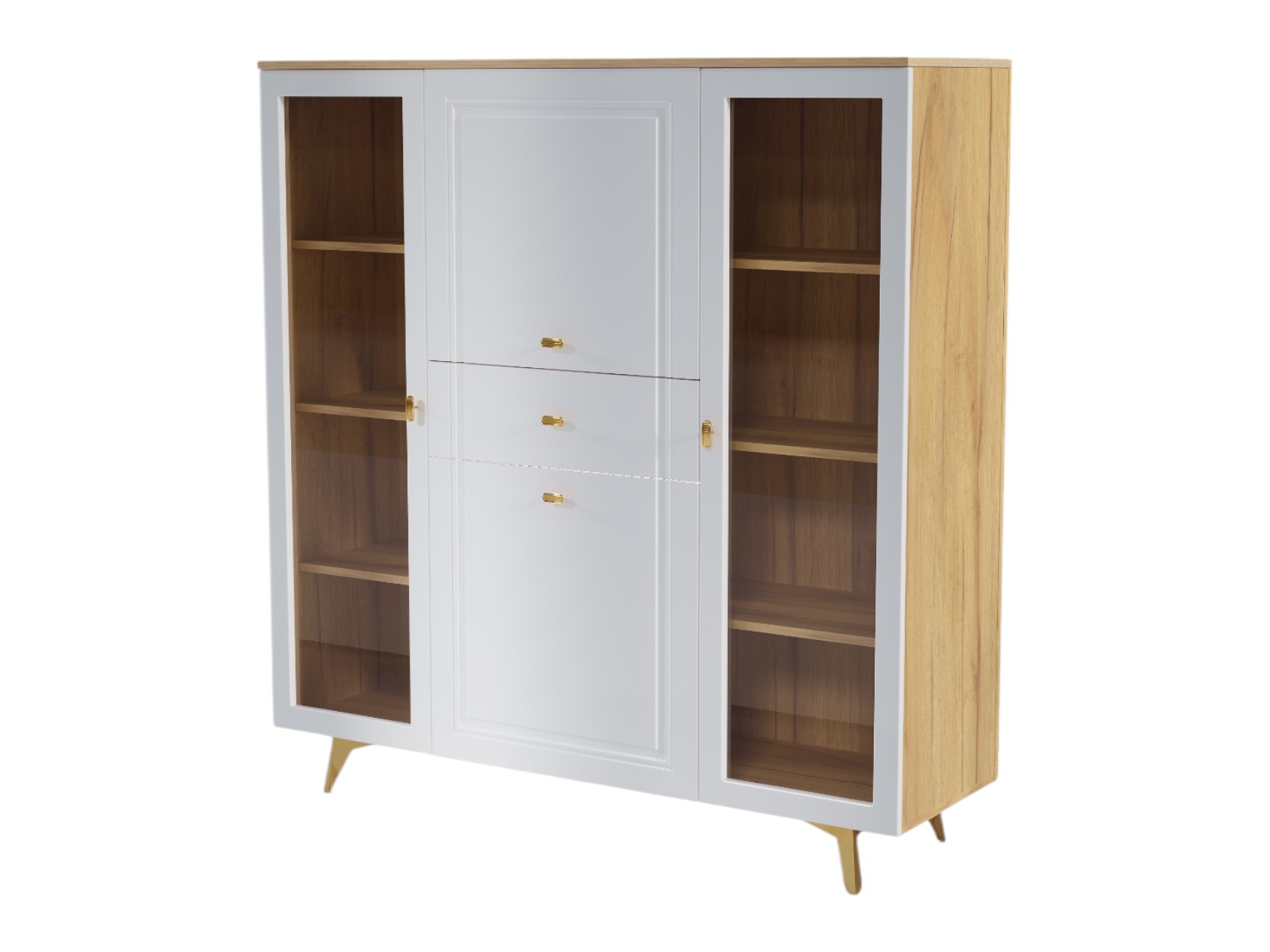 Шкаф-витрина Вега Сапфир 2 стеклодвери дополнит интерьер любой комнаты, расширив систему хранения. Симметрично расположенные прозрачные дверцы визуально облегчают облик модели и позволяют продемонстрировать красивую посуду, декор и редкие книги. Небольшие акцентные ножки в цвет фурнитуры — изюминка дизайна.