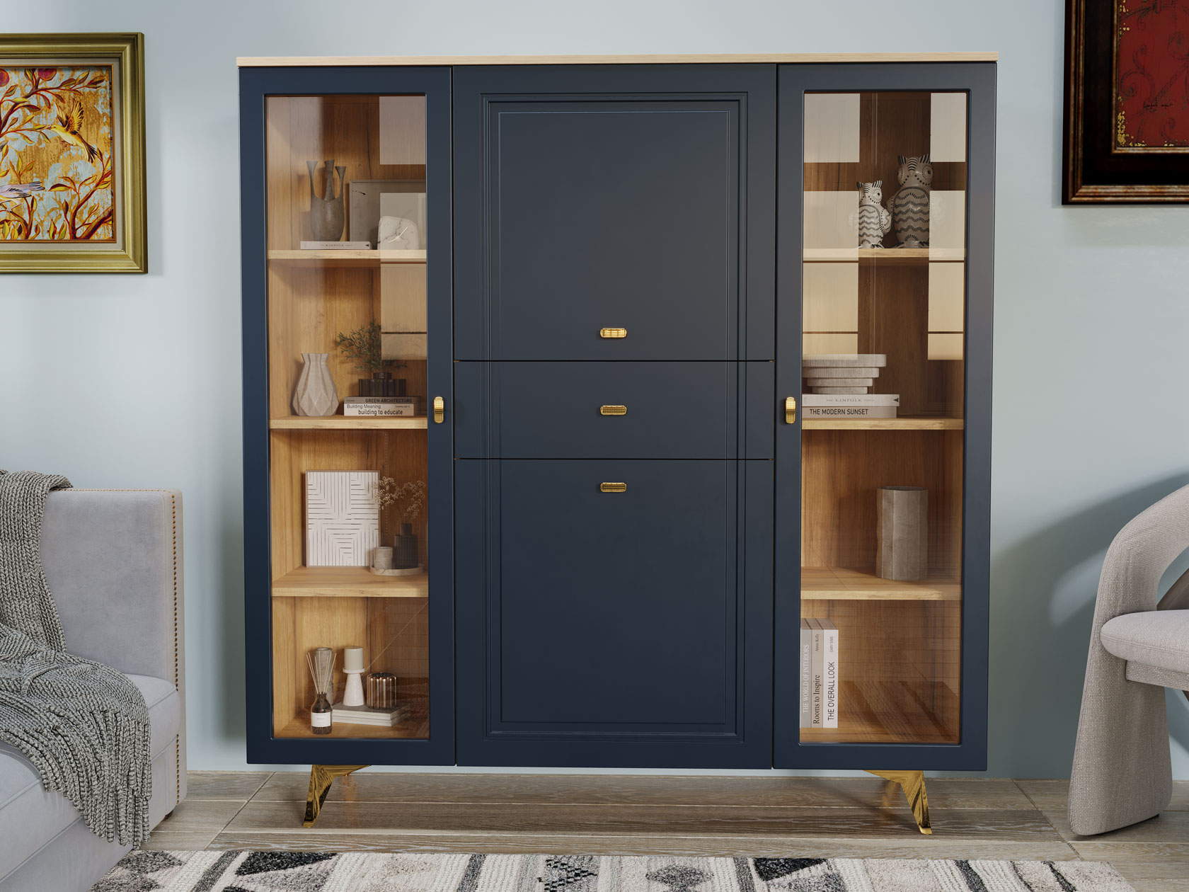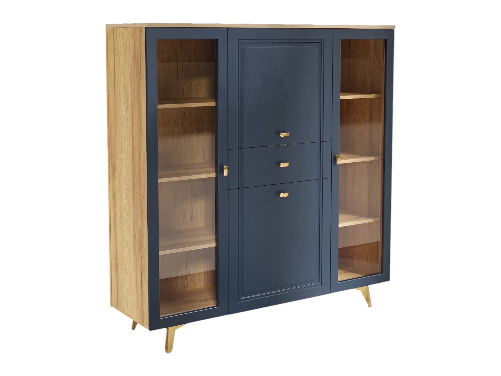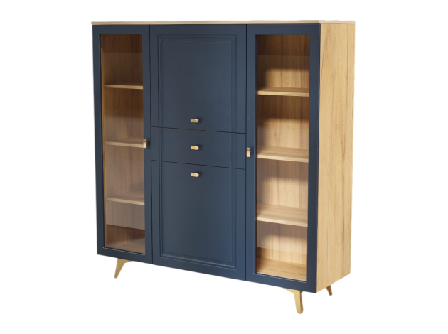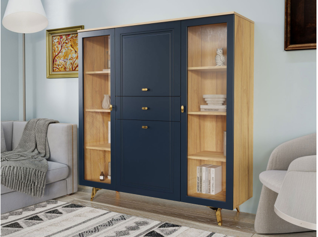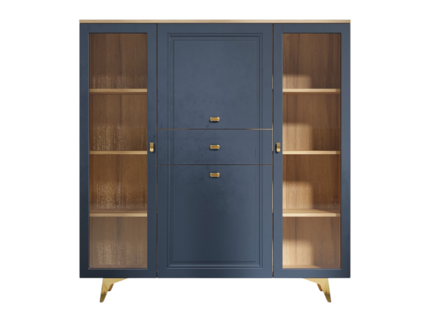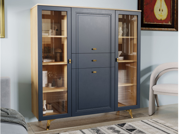 Шкаф-витрина Вега Сапфир 2 стеклодвери дополнит интерьер любой комнаты, расширив систему хранения. Симметрично расположенные прозрачные дверцы визуально облегчают облик модели и позволяют продемонстрировать красивую посуду, декор и редкие книги. Небольшие акцентные ножки в цвет фурнитуры — изюминка дизайна.