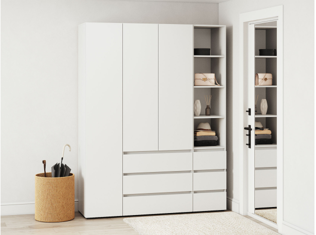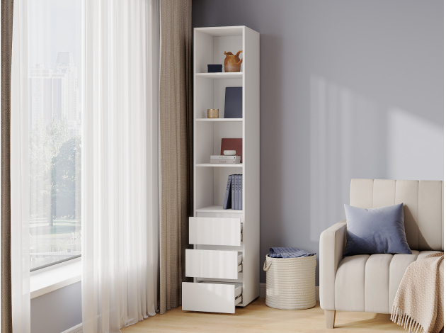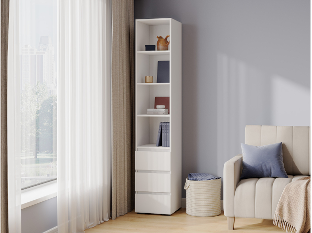Стеллаж Элли с ящиками — универсальная модель для квартиры или офиса. Лаконичный дизайн в сочетании с удобной системой хранения делает стеллаж актуальным решением для любого интерьера. На полках и в ящиках найдется место для любых нужных вещей: от предметов гардероба до книг и декора.