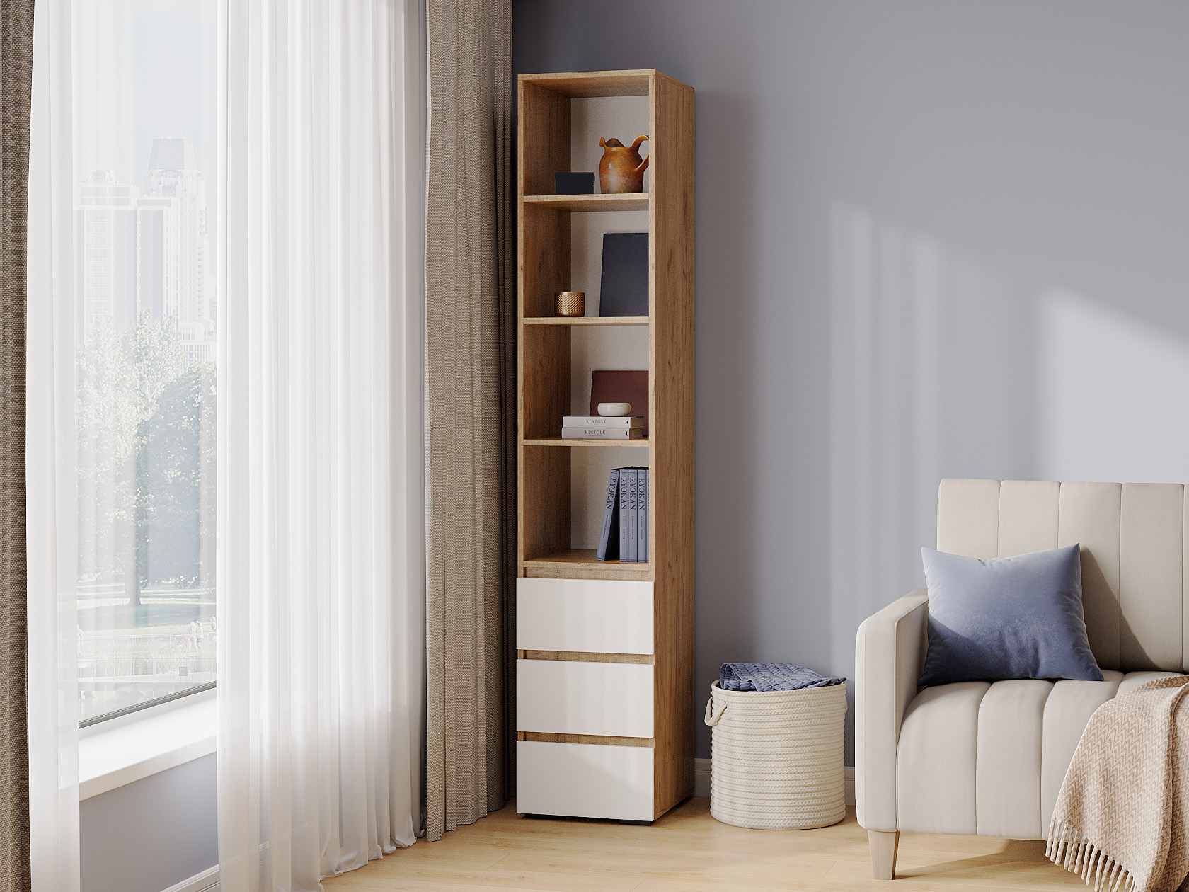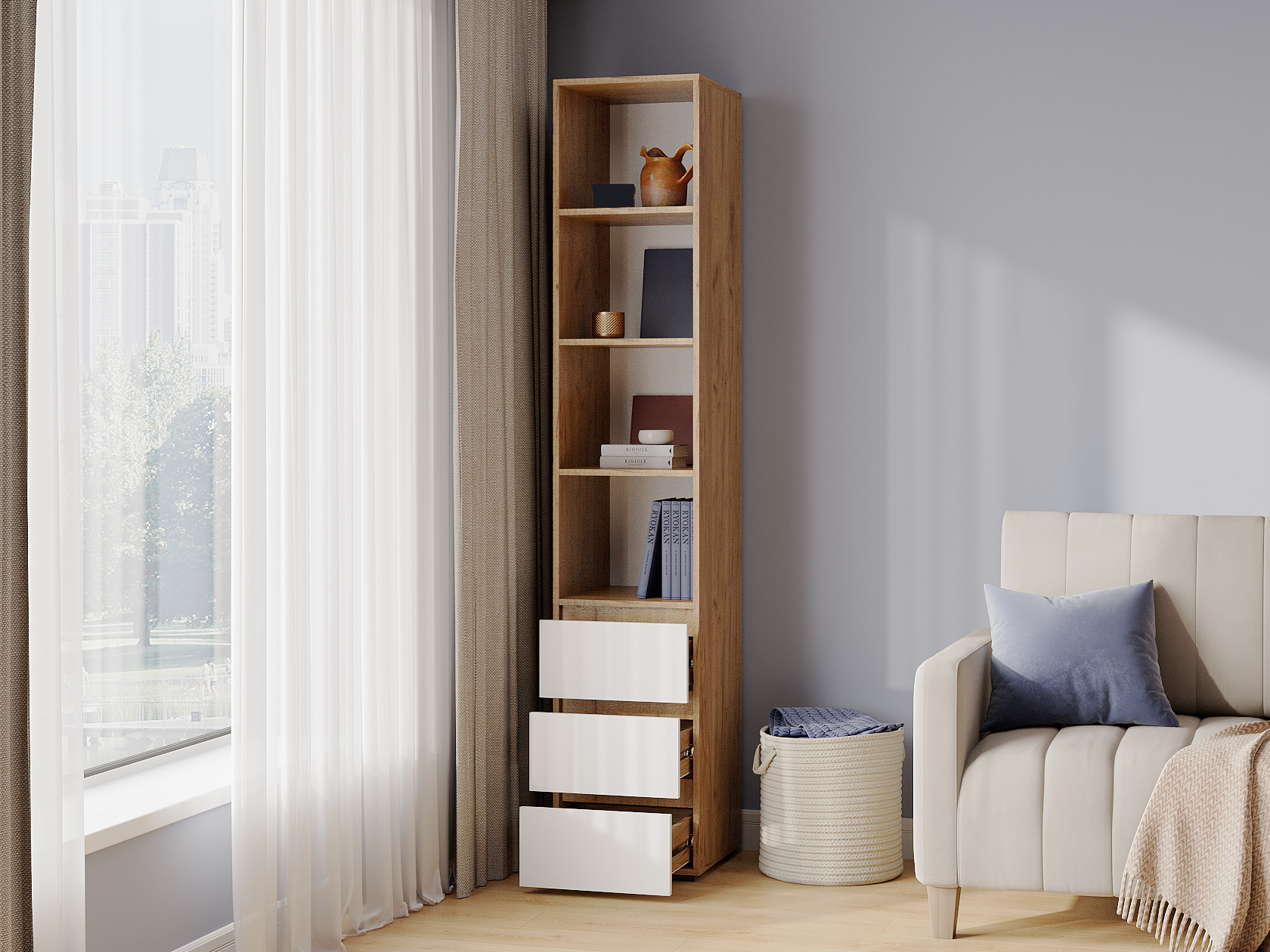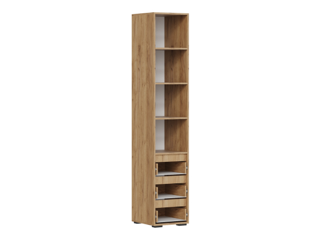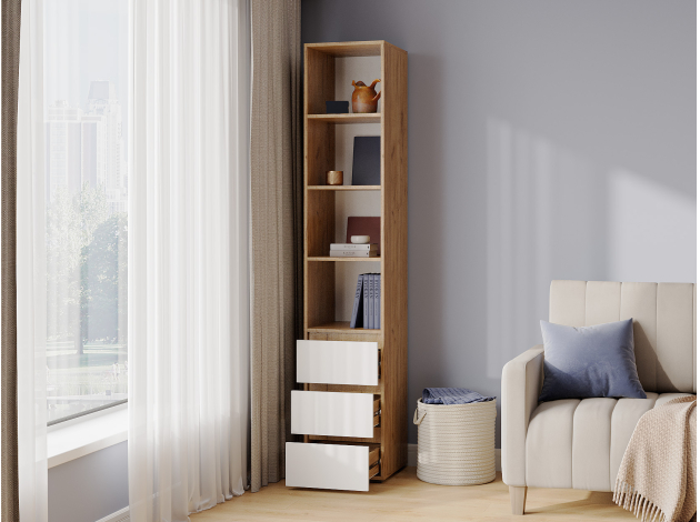 Стеллаж Элли с ящиками — универсальная модель для квартиры или офиса. Лаконичный дизайн в сочетании с удобной системой хранения делает стеллаж актуальным решением для любого интерьера. На полках и в ящиках найдется место для любых нужных вещей: от предметов гардероба до книг и декора.