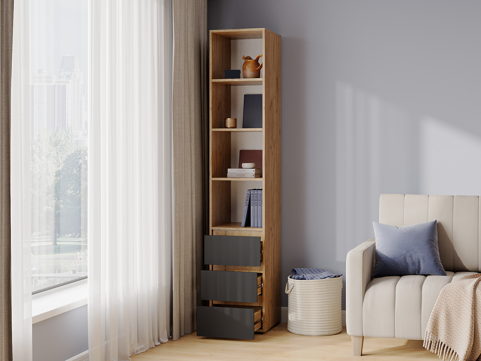 Стеллаж Элли с ящиками — универсальная модель для квартиры или офиса. Лаконичный дизайн в сочетании с удобной системой хранения делает стеллаж актуальным решением для любого интерьера. На полках и в ящиках найдется место для любых нужных вещей: от предметов гардероба до книг и декора.