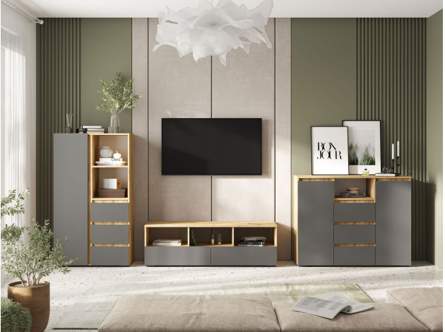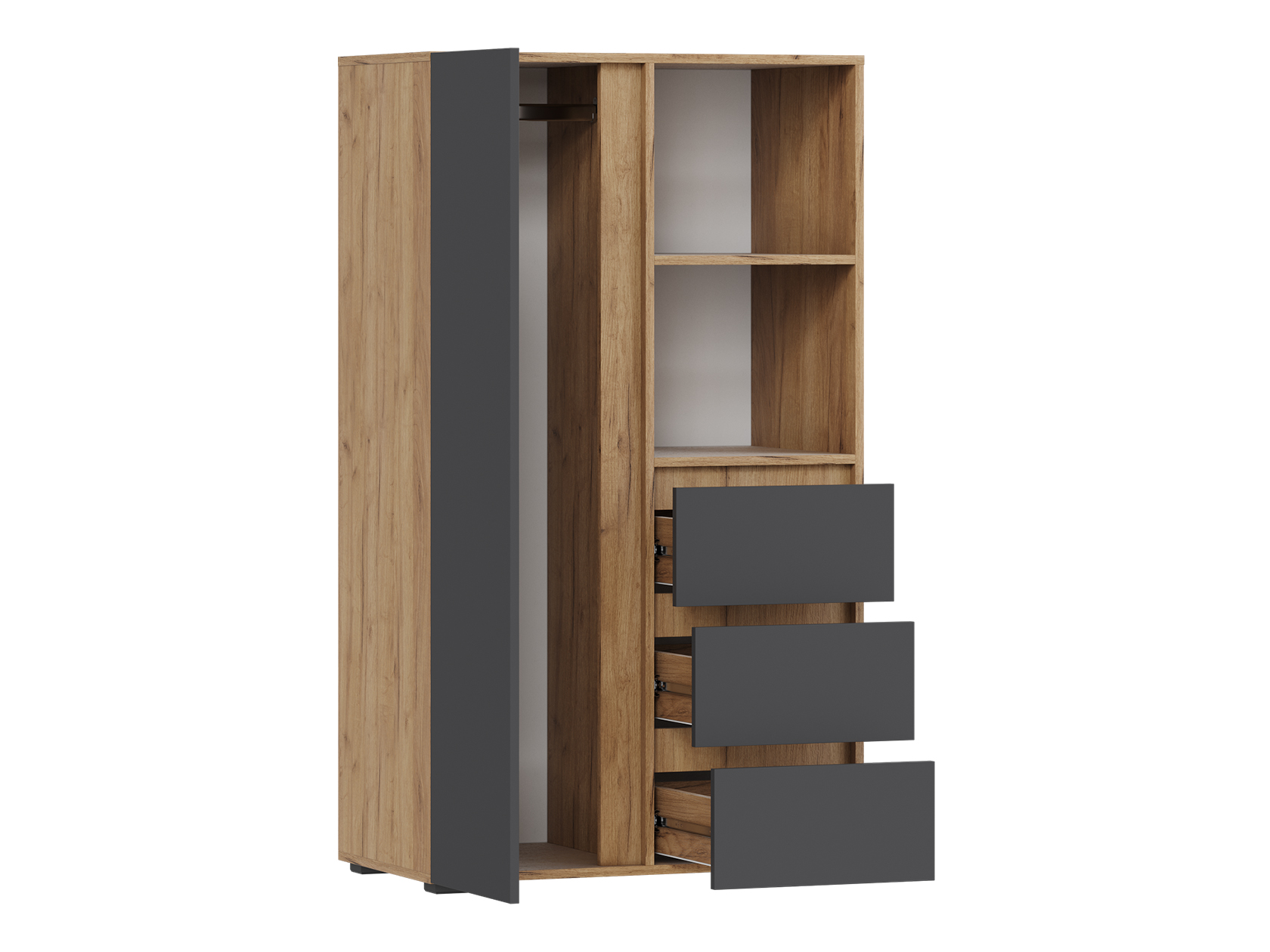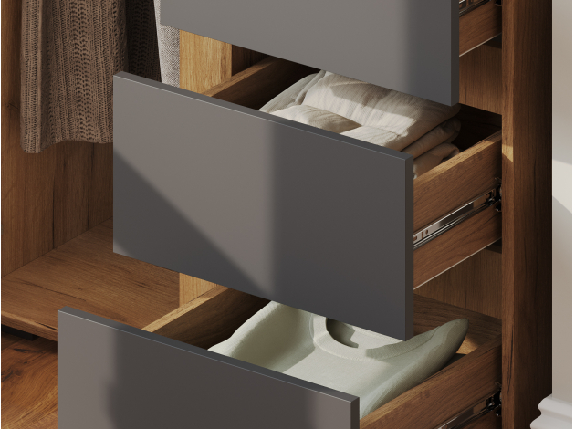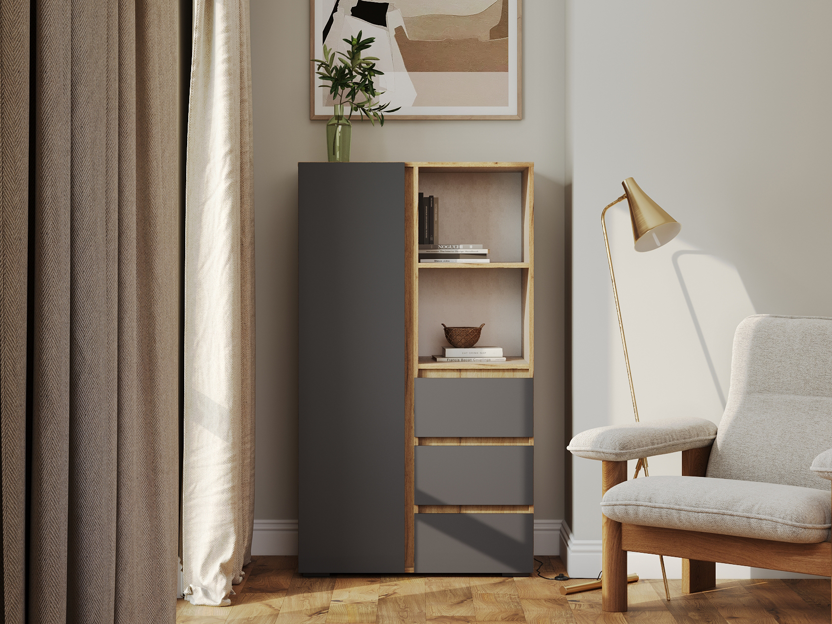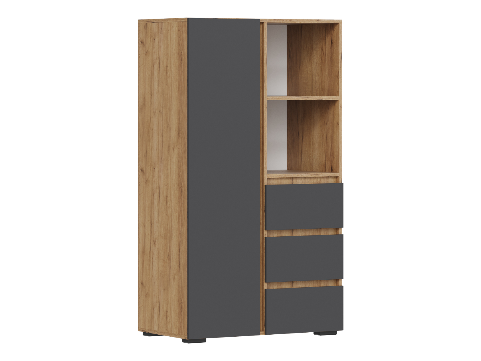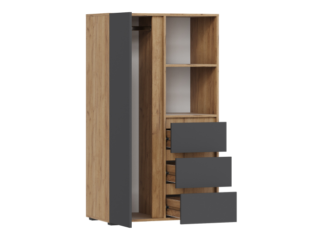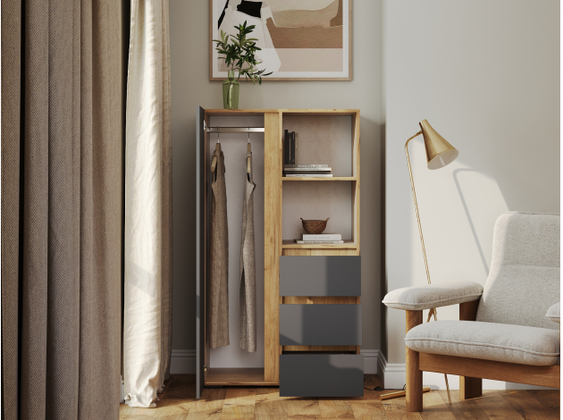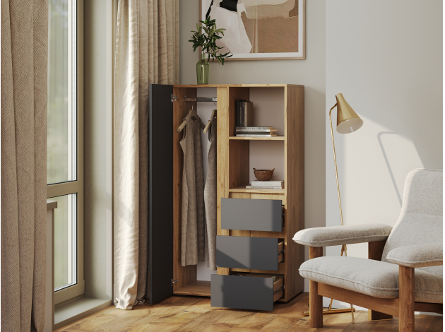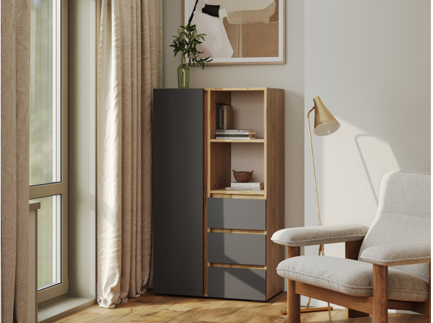 Стеллаж Элли с дверцей и ящиками организует комфортное хранение различных вещей. Универсальная модель украсит пространство гостиной, прихожей или спальни. Открытые ниши подходят для размещения статуэток, фоторамок и другого декора, который придает интерьеру индивидуальность.