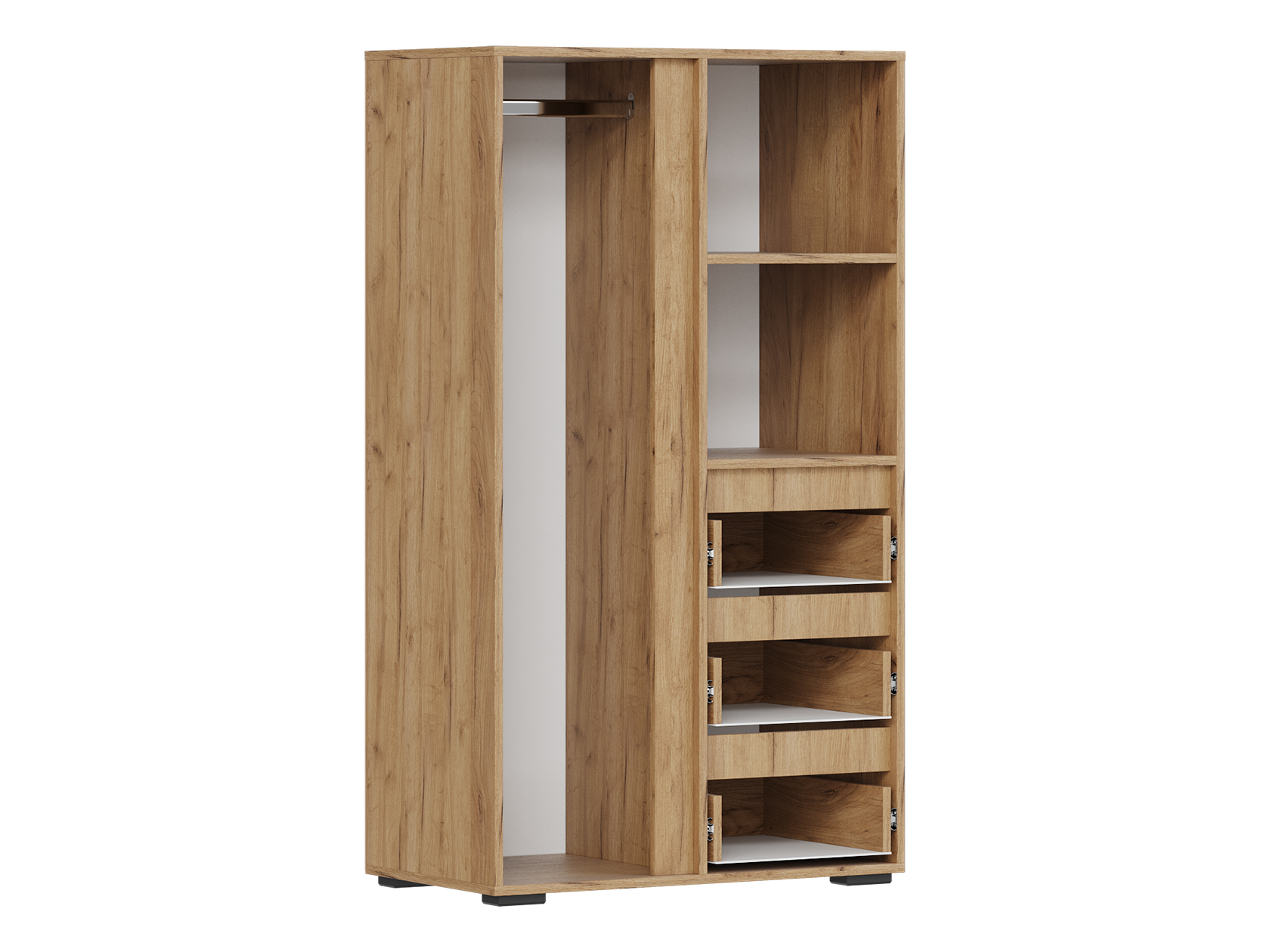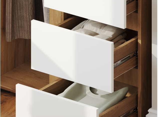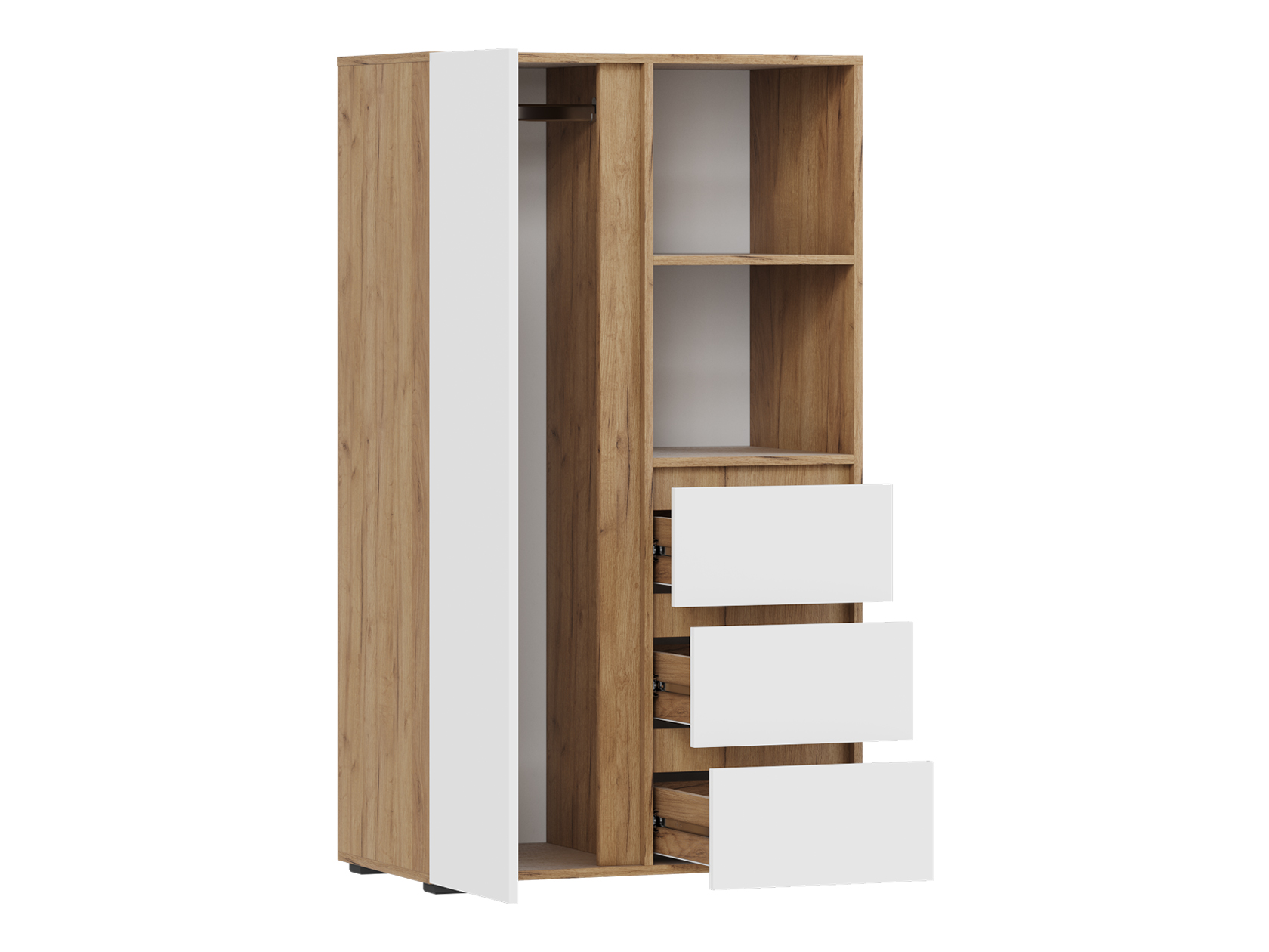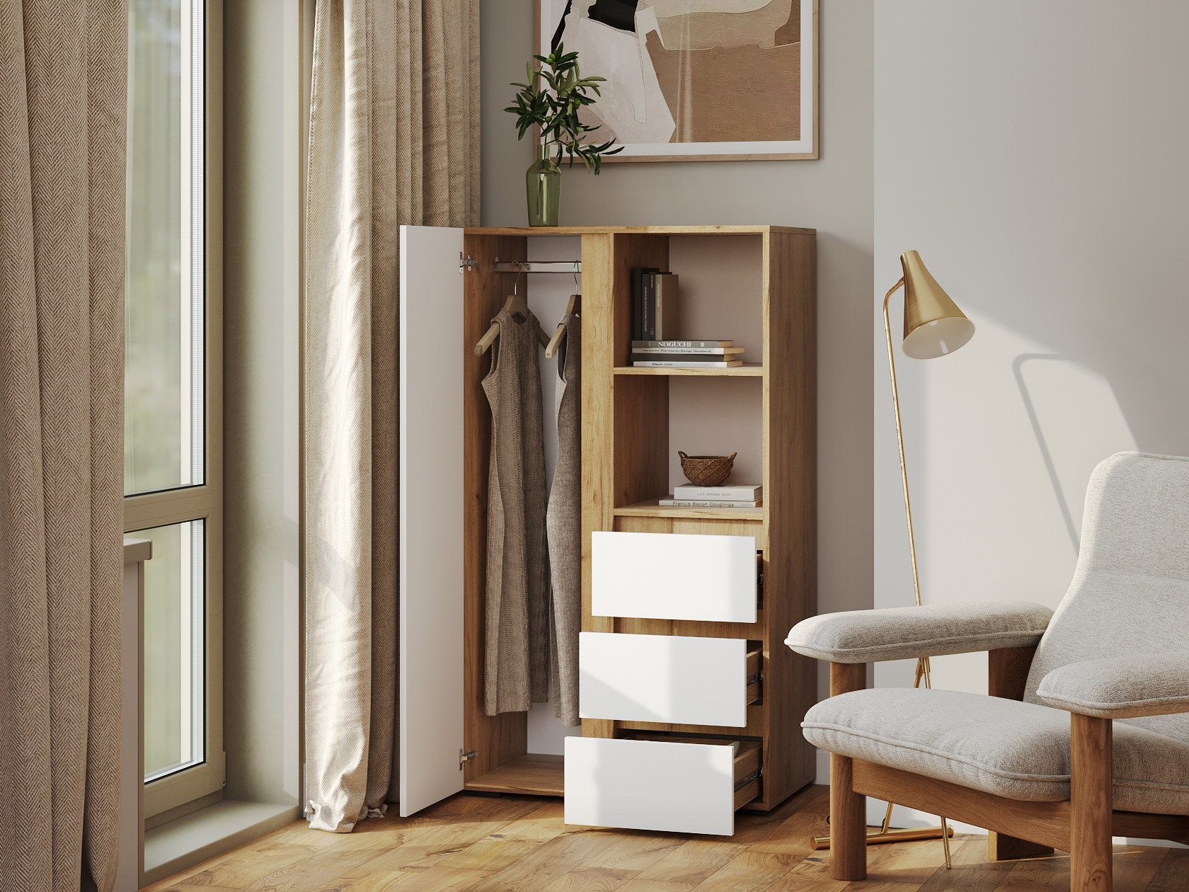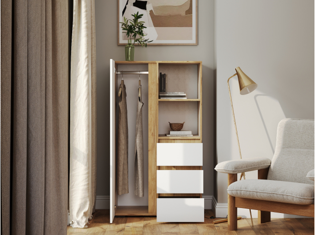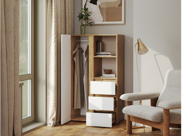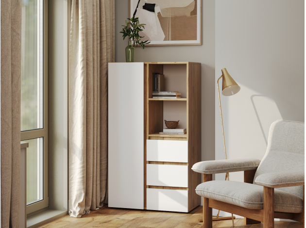 Стеллаж Элли с дверцей и ящиками организует комфортное хранение различных вещей. Универсальная модель украсит пространство гостиной, прихожей или спальни. Открытые ниши подходят для размещения статуэток, фоторамок и другого декора, который придает интерьеру индивидуальность.